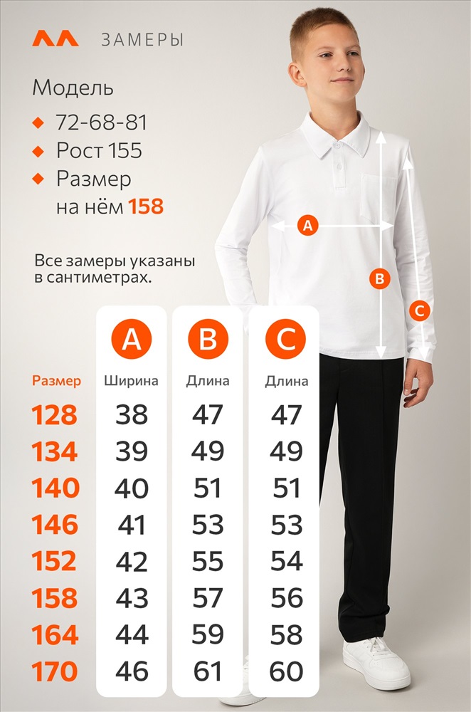 Модель Иван, его рост 155, параметры: 72-68-81. На нем размер 158.