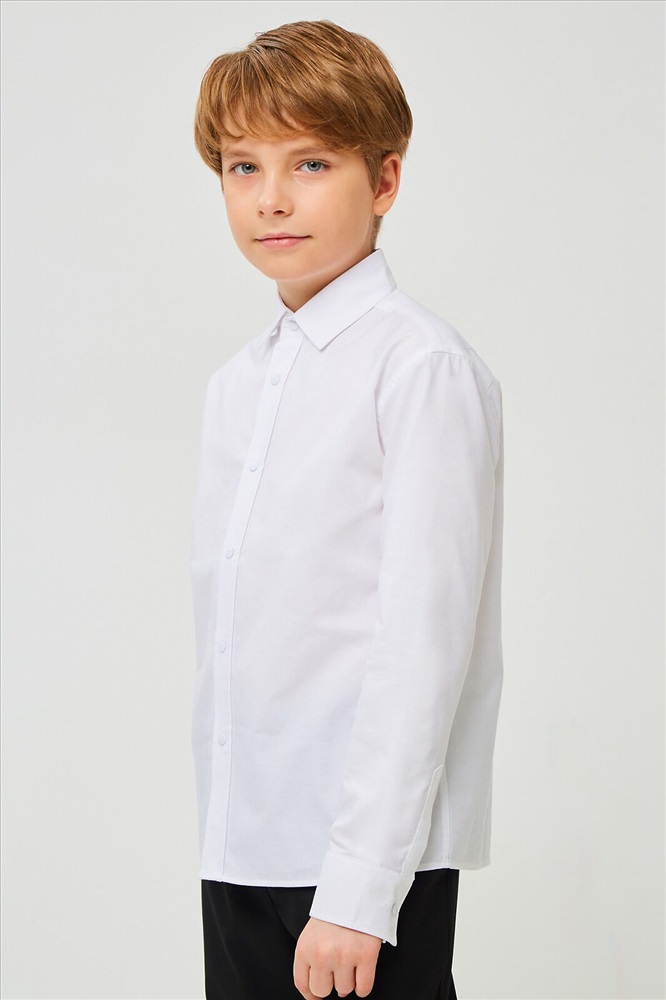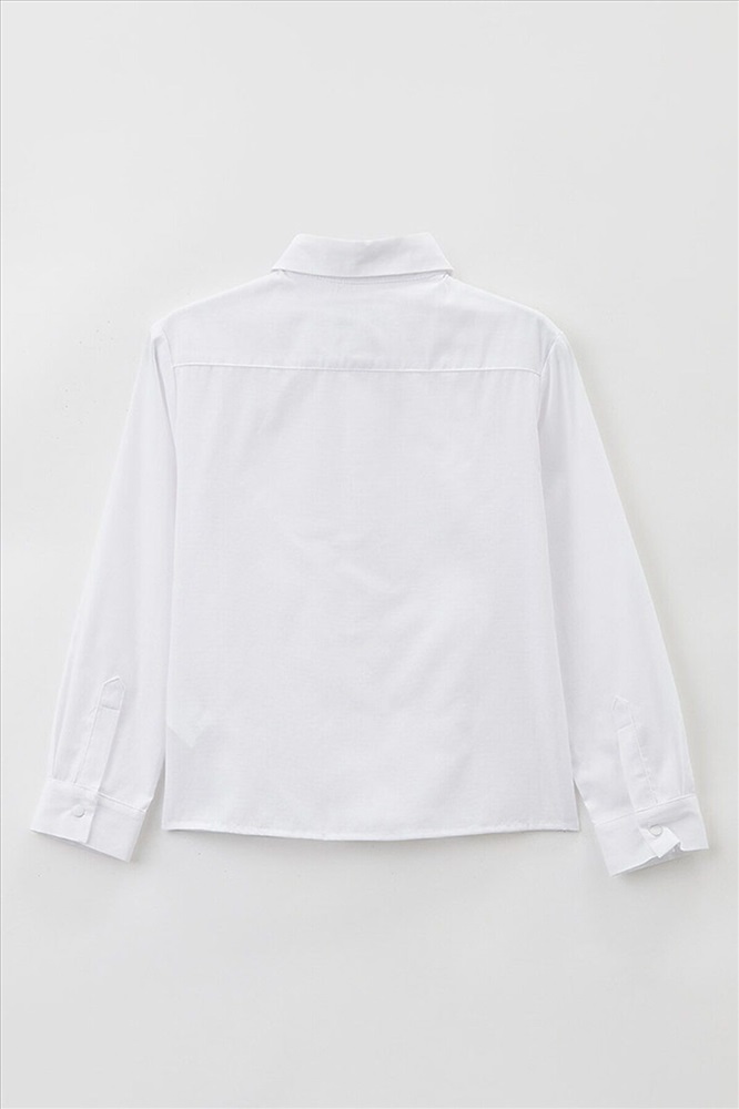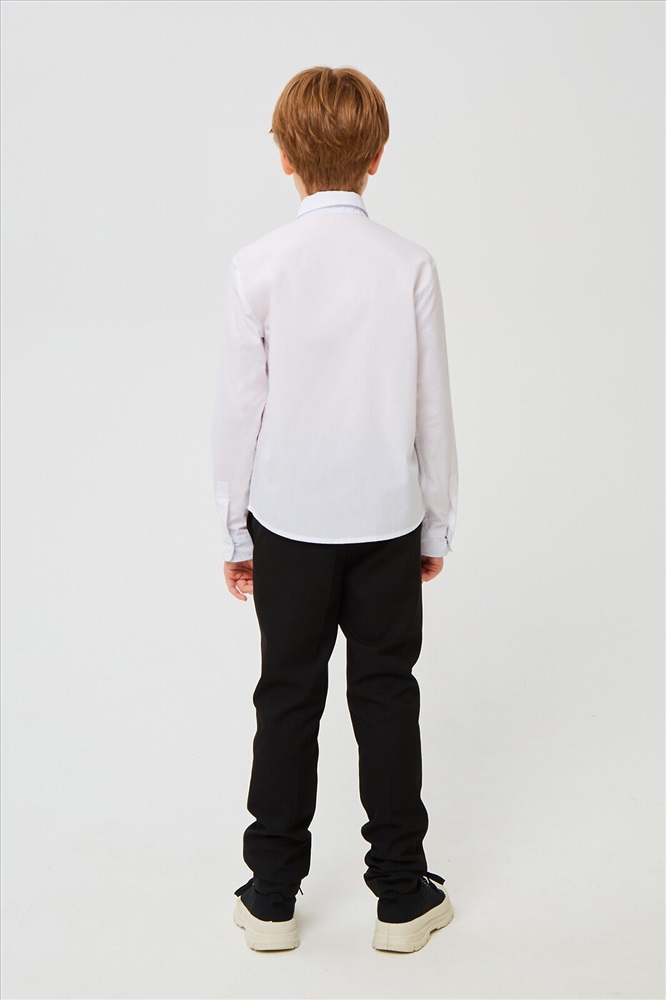 Сорочка для мальчика из смесового хлопка полуприлегающего силуэта. На спинке - кокетка. Воротник отложной со стойкой. Застёжка по центру переда на планку с кнопками. Рукава рубашечные со шлицами и манжетами.