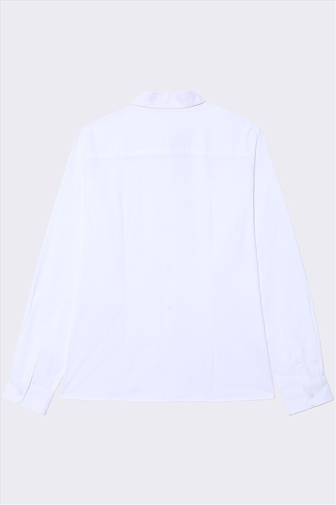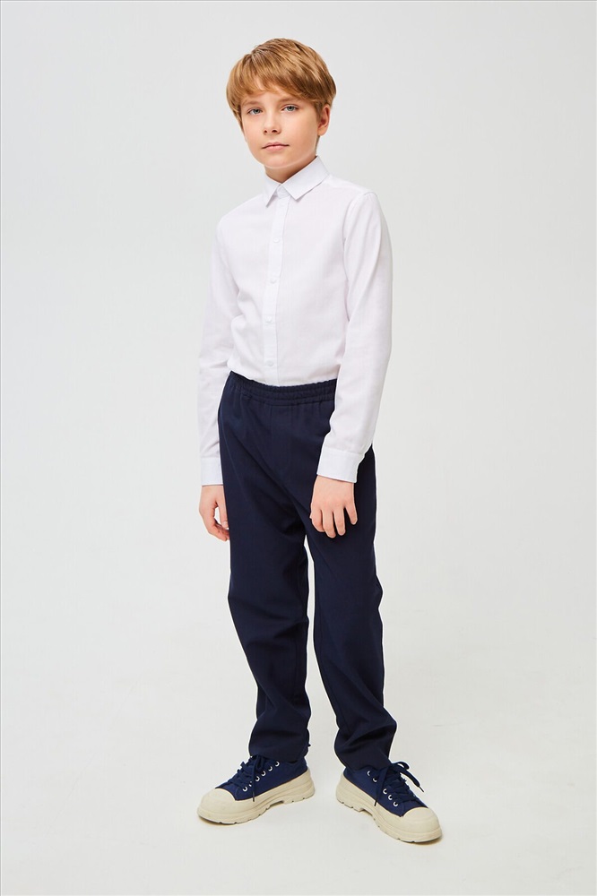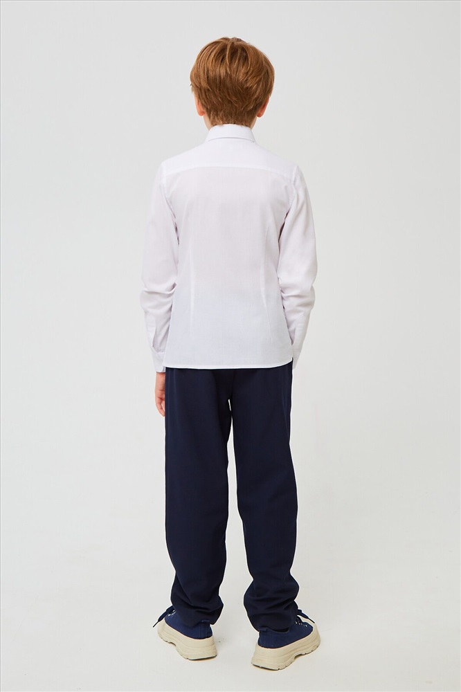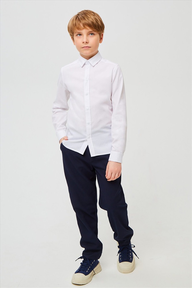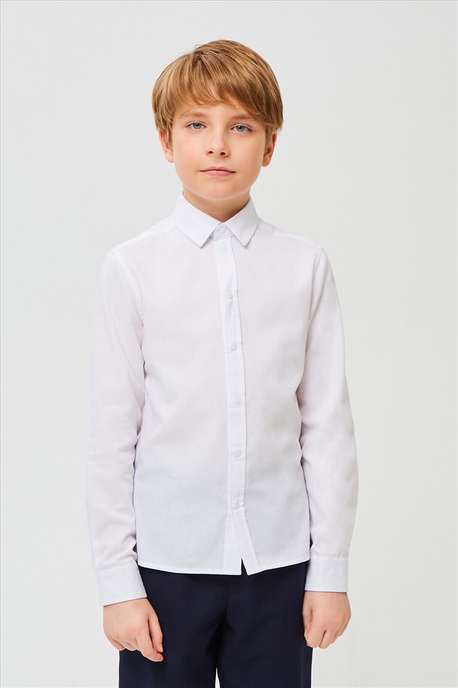 Сорочка для мальчика из смесового хлопка полуприлегающего силуэта. На спинке - кокетка. Воротник отложной со стойкой. Застёжка по центру переда на планку с пугавицами. Рукава рубашечные со шлицами и манжетами.