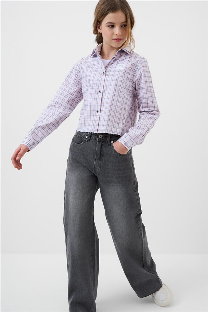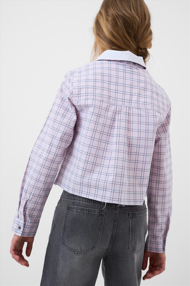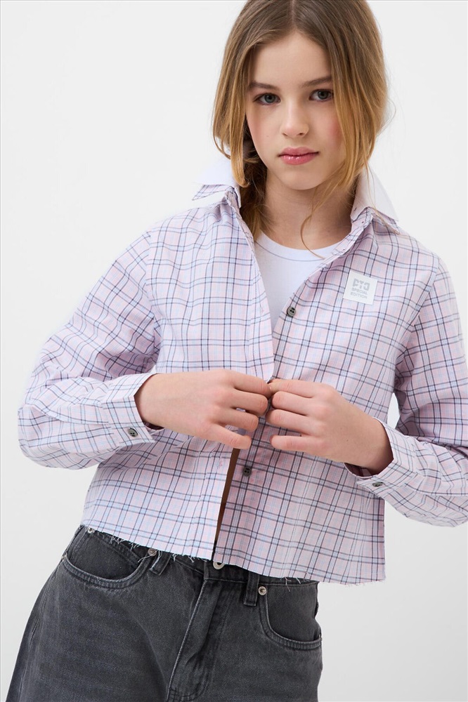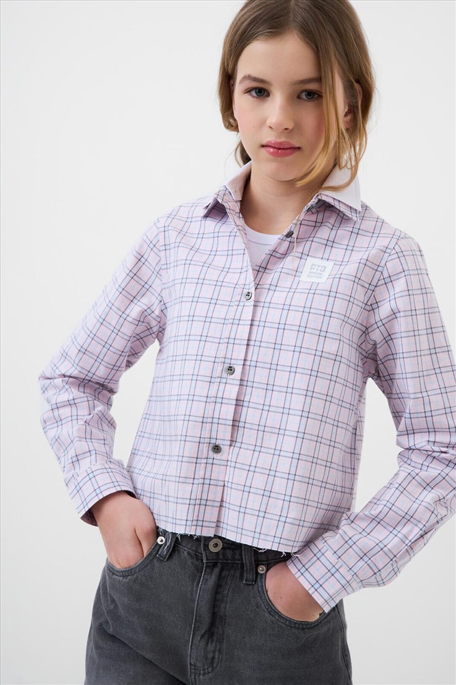 Рубашка в клетку для девочки подростка. Выполнена из мягкой, хлопковой ткани поплин. Отложной воротник. Спереди — классическая застёжка на пуговицы. Небольшой логотип на груди. На спинке — декоративная кокетка и складка. Рукава длинные с манжетами на пуговицах. Необработанный край.