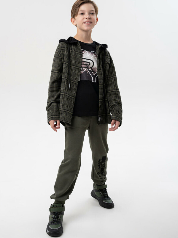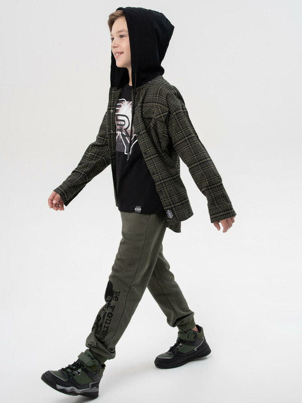 Преимущества модели: + 100% хлопок — натуральная ткань, дышащая и безопасная для кожи + мягкая фланель — приятна к телу и отлично согревает в прохладную погоду + удобная застежка на кнопки — легко надевать и снимать + накладной карман и стильные принты — современный дизайн + капюшон — защита от ветра и дополнительный комфорт + регулировка капюшона шнурком Когда и как носить: Эта рубашка идеально подойдет для школы, прогулок, встреч с друзьями и повседневных образов. Ее можно носить как самостоятельный элемент с джинсами или брюками, а также использовать как легкую верхнюю одежду поверх футболки. Советы по стилю: Сочетайте рубашку с джинсами и кедами от PlayToday для создания современного подросткового образа или надевайте поверх базовой футболки для многослойного casual-лука. Размеры: 128-176 для мальчиков подростков и школьников от 8 до 17 лет Модная и удобная фланелевая рубашка в клетку с капюшоном — стильное решение для подростков от PlayToday! Состав:Ткань 1: 100% хлопок; Ткань 2: 95% хлопок, 5% эластан Комментарии к товару