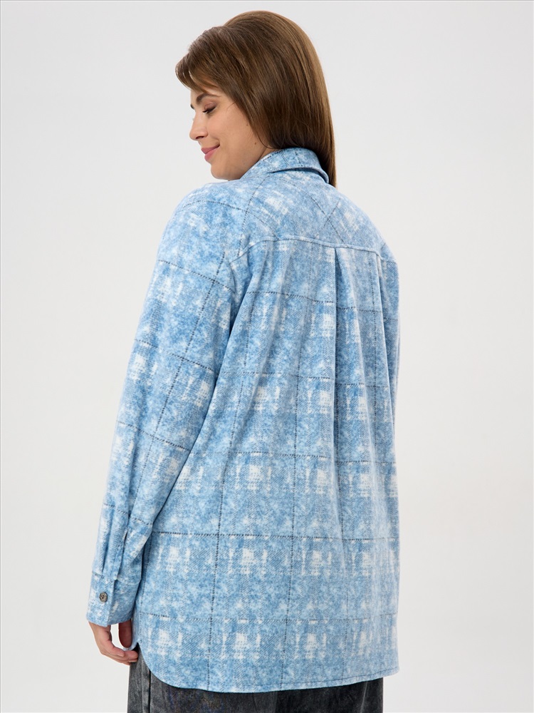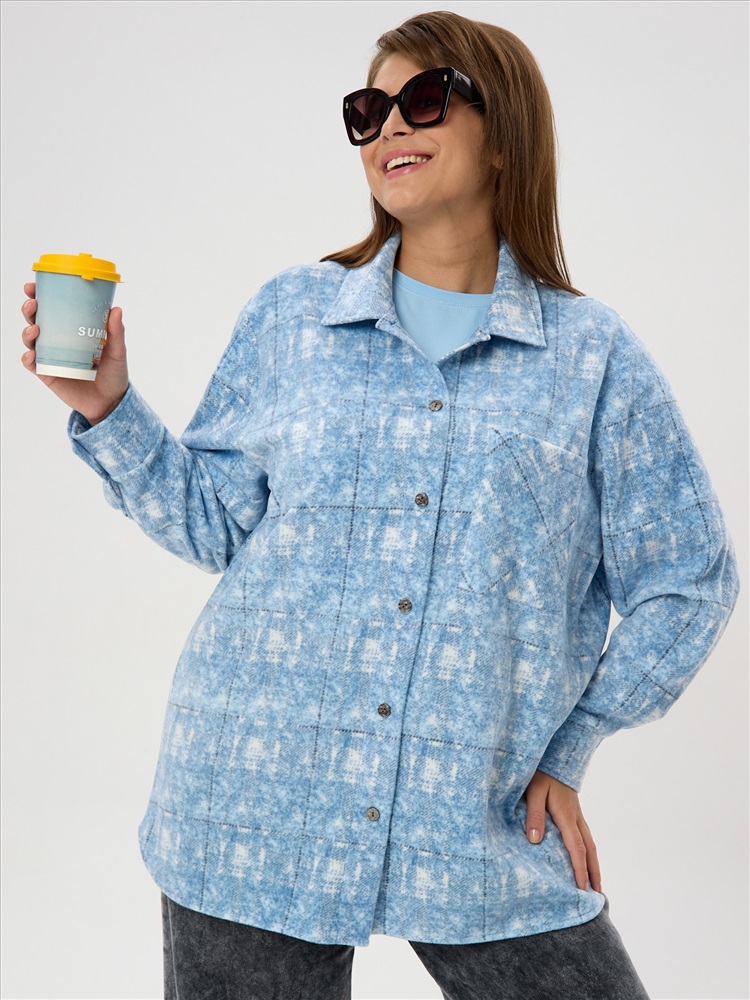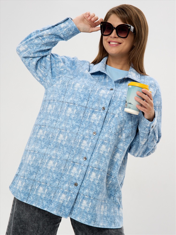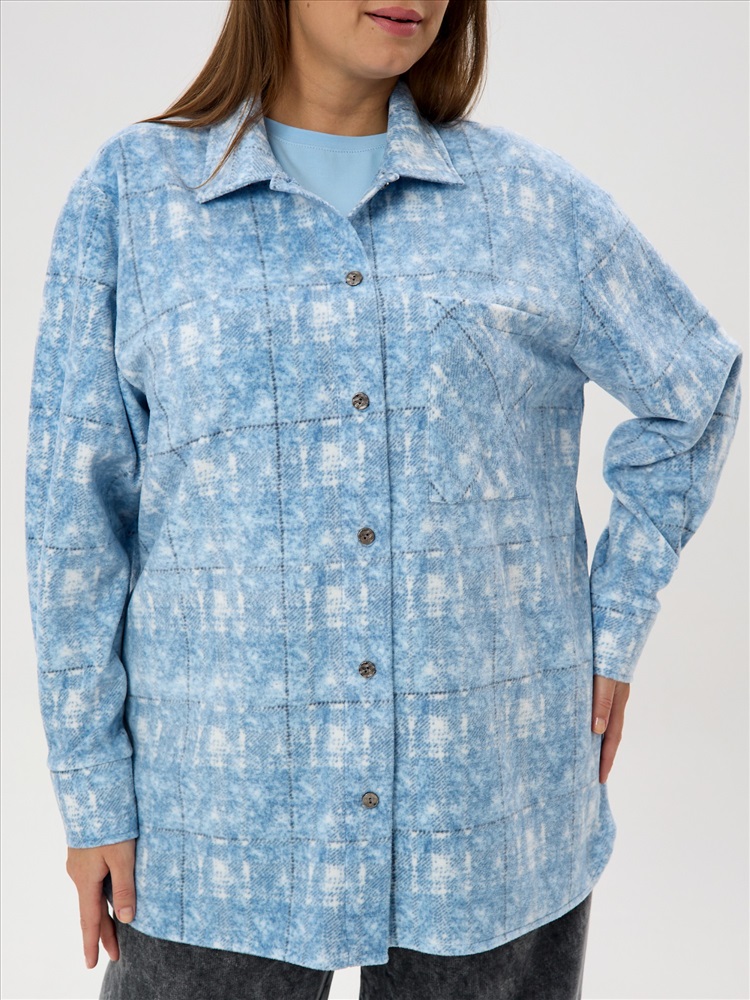 Рубашка (туника) молодежная из трикотажного полотна «флис» с эффектом «варенки», полуприлегающего силуэта, с длинными втачными рукавами на притачных манжетах, стояче-отложным воротником, нагрудным карманом, фигурным низом и центральной бортовой застежкой на петли и пуговицы. Спинка – с отрезной кокеткой и бантовой складкой в центре соединительного шва.