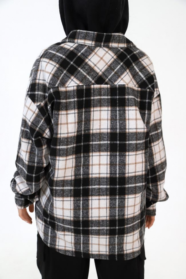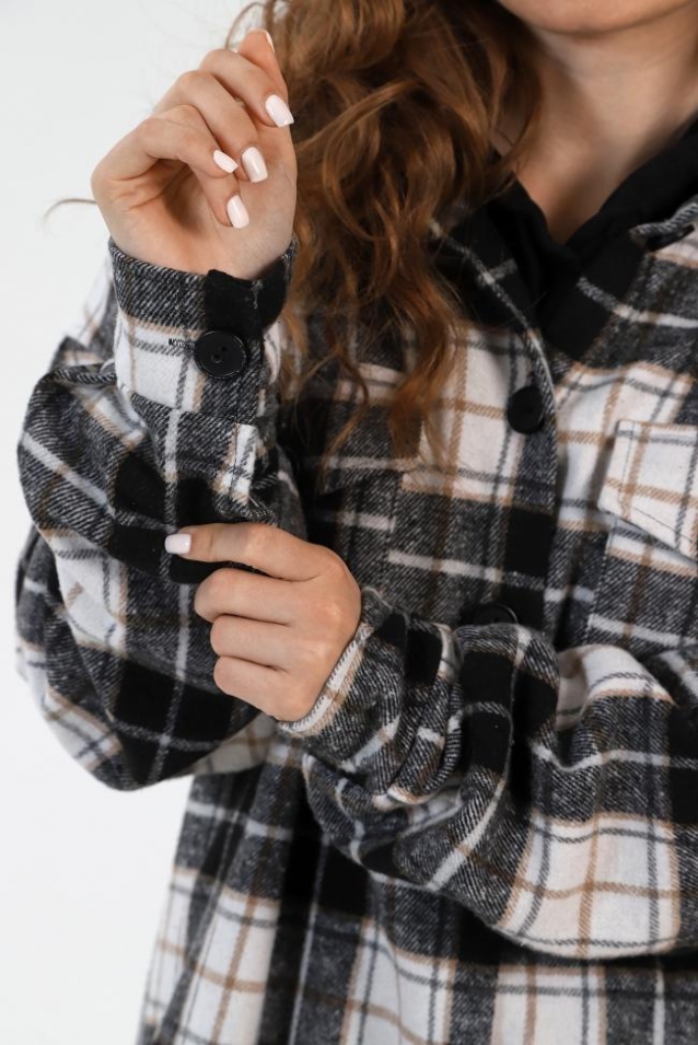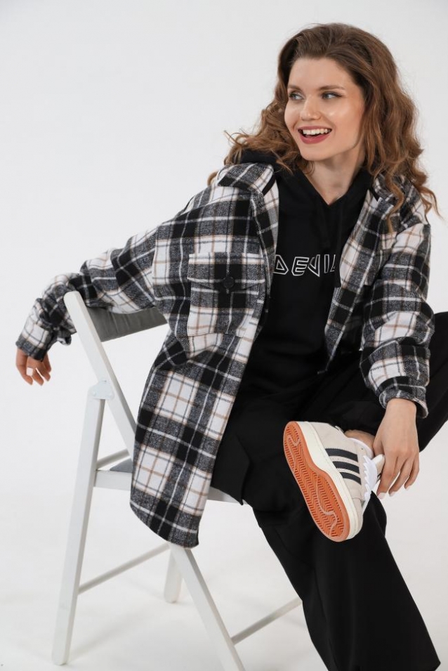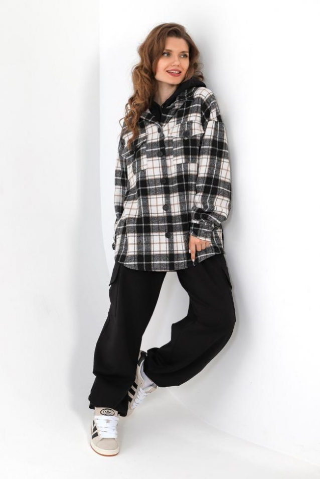 Рубашка женская из тканого полотна с рисунком в крупную клетку, длинными втачными рукавами с разрезами на притачных манжетах, застегивающимися на обметанные петли и пуговицы, фигурной линией низа и стояче-отложным воротником. Полочки - с двумя нагрудными карманами и клапанами фигурной формы. Спинка - с притачной кокеткой, выкроенной по косой. В швах соединения манжет с рукавами обработаны по одной складочке. При эксплуатации изделия следует обратить внимание на то, что после ВТО и стирки материал дает усадку по ширине и длине.