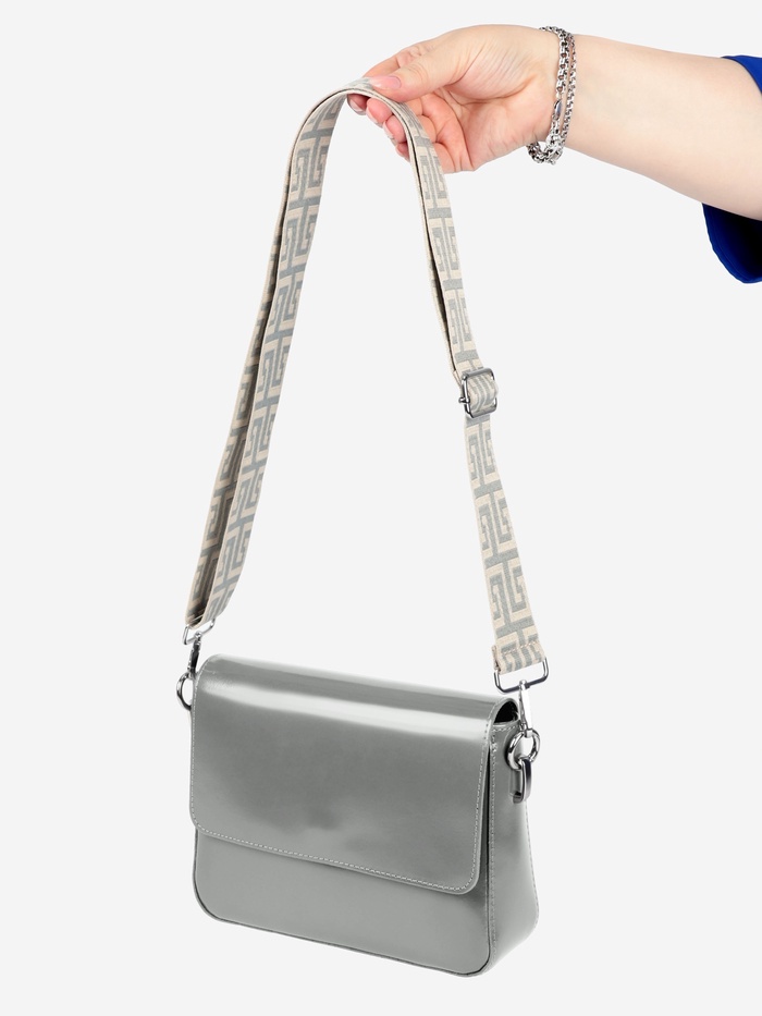 Элегантный ремень с греческим орнаментом придаст вашей сумке средиземноморский шарм. Сдержанная серо-молочная гамма с серебристыми карабинами создает благородный образ, а длина 139 см обеспечивает удобное ношение через плечо.