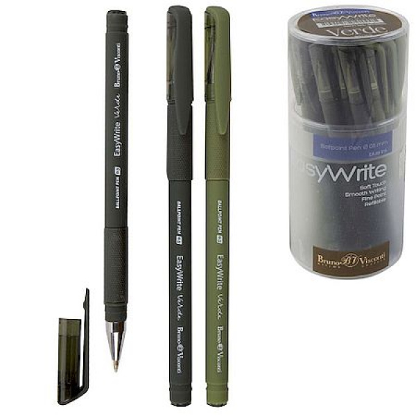 Ручки «EasyWrite.Verde» ТМ Bruno Visconti отличаются повышенным комфортом и эргономичностью. Все это благодаря покрытию Soft Touch и прорезиненному грипу, позволяющим осуществлять захват ручки без напряжения кисти. Стержни с шариковым пишущим узлом толщиной 0.5 мм заправлены немецкими пигментными чернилами (Dokumental) синего цвета. Чернила не растекаются, не пачкают, обеспечивают мягкое письмо. Все ручки снабжены колпачками с клип-зажимом под цвет корпуса.