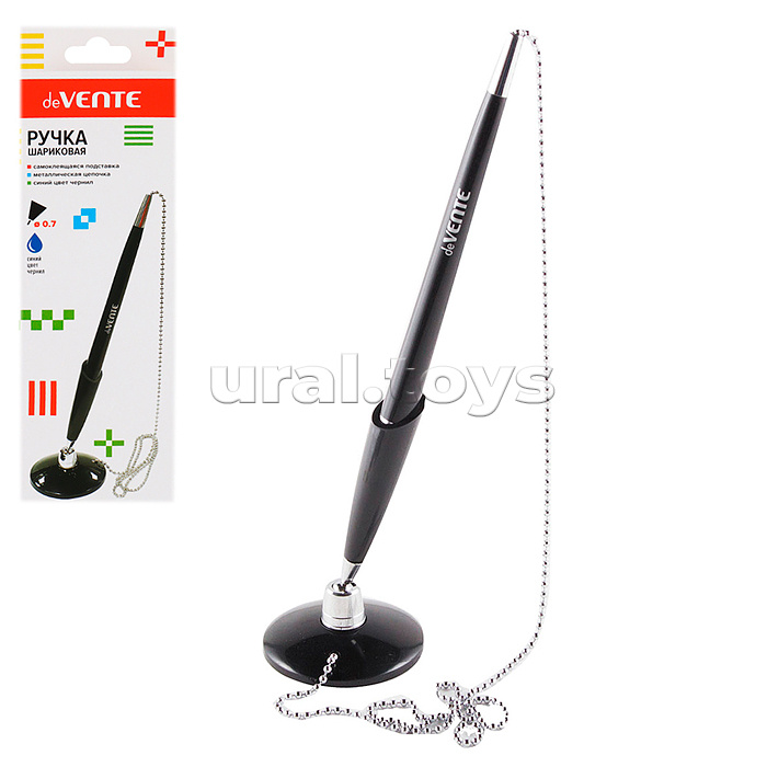 Ручка шариковая на самоклеящейся подставке d=0,7 мм, с металлической цепочкой, черный непрозрачный корпус, сменный стержень, в картонной коробке, синий цвет чернил