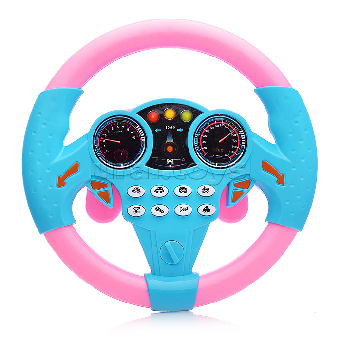 Звуки запуска двигателя, клаксона, аварийки, три вида сирен и пять мелодий без слов. Руль крепится на присоски. Работает от 2 батареек «АА» (не входят в комплект). Размеры руля: 20 х 20 см. Материал: пластмасса. Соответствует требованиям безопасности продукции. Для детей от 3-х лет.