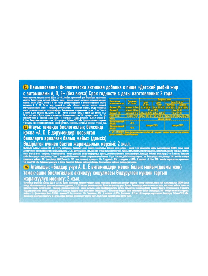 Показания: в качестве источника полиненасыщенных жирных кислот Омега-3 (в том числе эйкозапентаеновой и докозагексаеновой), дополнительного источника витаминов А, Д, Е.