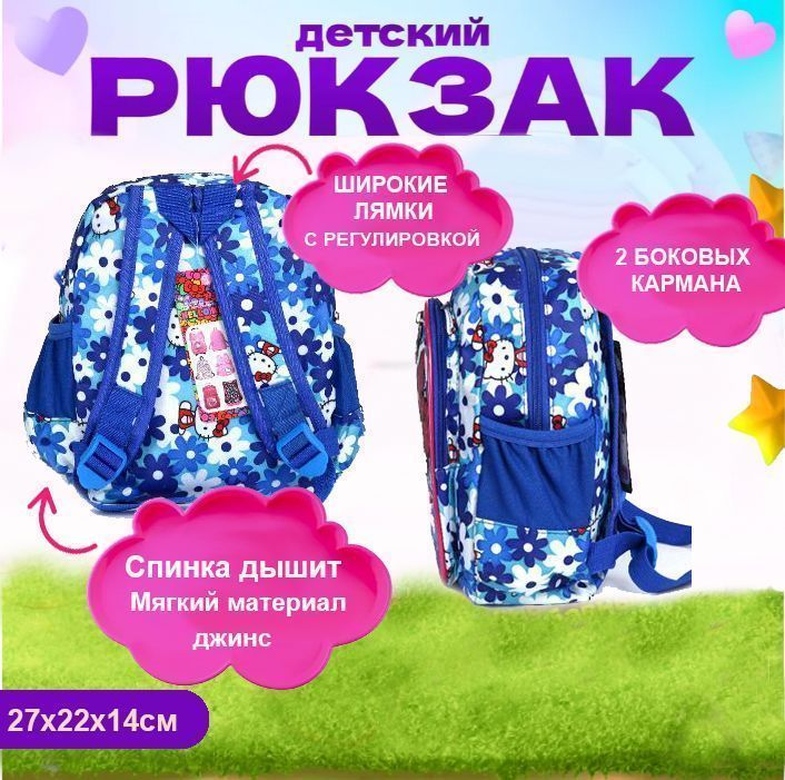 Удобный джинсовый рюкзачок с сетчатой дышащей спинкой и приятной аппликацией. Содержит основной раздел, передний карман на молнии и два боковых сетчатых кармашка.
