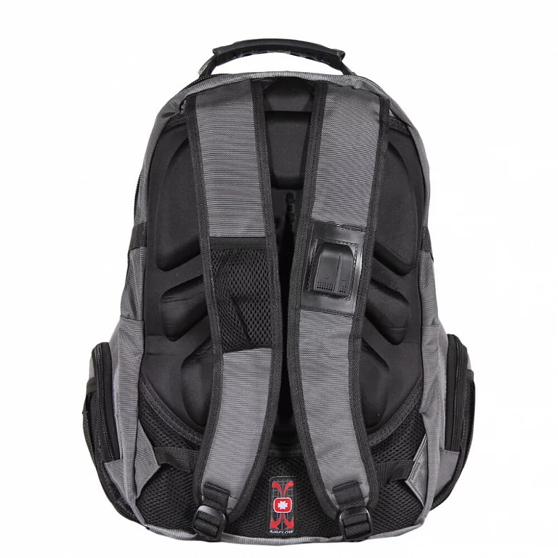 Модель имеет два основных отдела на молниях, на передней стенке три кармана на молнии, по бокам два кармашка из сетки для бутылочек с водой и два кармашка на молниях, так же по бокам имеются ремни-расширители. Мягкие лямки с рельефной поверхностью регулируются по длине, на лямках выход для наушников и USB разъем для подключения внешнего зарядного устройства, один открытый кармашек. На дне рюкзака отдел для чехла и чехол от дождя. Спинка рюкзака со специальной рельефной поверхностью, обеспечивающей удобное прилегание к спине и циркуляцию воздуха. Внутри подкладочный материал. Внутри кармана спереди имеется карман-органайзер для мелких предметов.