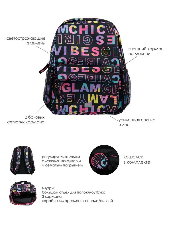 Школьный рюкзак для девочки подростка. Широкие регулируемые лямки с мягкими вкладками и сетчатым покрытием. Основной отдел на молнии, карман на молнии, 2 боковых сетчатых кармана. Внутри рюкзака в школу: отдел для папок, карман на молнии, 2 кармана без замка, карабин для крепления пенала/ключей. Усиленная спинка и дно. Светоотражающие элементы на переднем кармане и плечевых ремнях. Кошелек в подарок.
