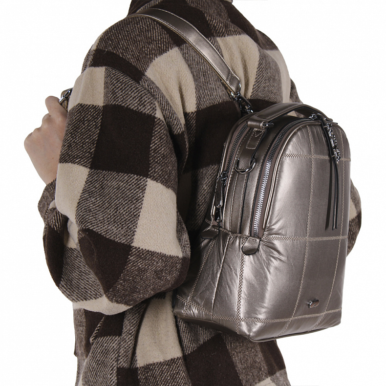 Материал: Экокожа Рюкзак-трансформер, выполнена из экокожи.  Дополнена серебристой фурнитурой. Данная модель закрывается на молнии. Каркас полужесткий. Носится как сумка или как рюкзак. Ремни съемные, так же есть встроенная ручка.