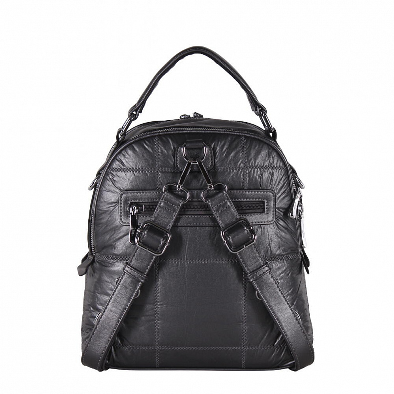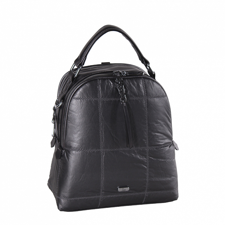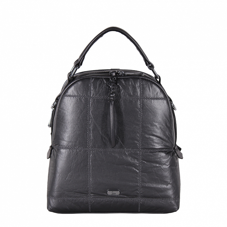 Рюкзак-трансформер, выполнена из экокожи. Дополнена серебристой фурнитурой. Данная модель закрывается на молнии. Каркас полужесткий. Носится как сумка или как рюкзак. Ремни съемные, так же есть встроенная ручка.