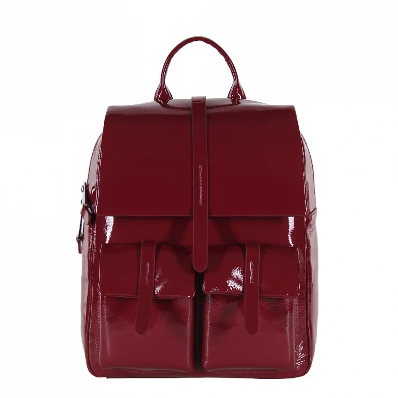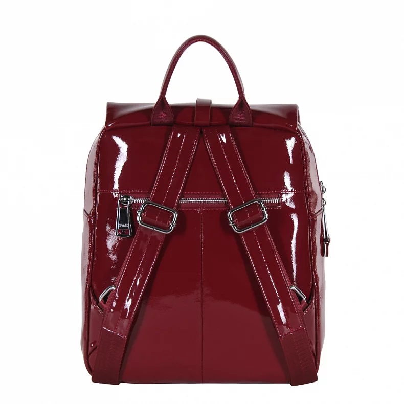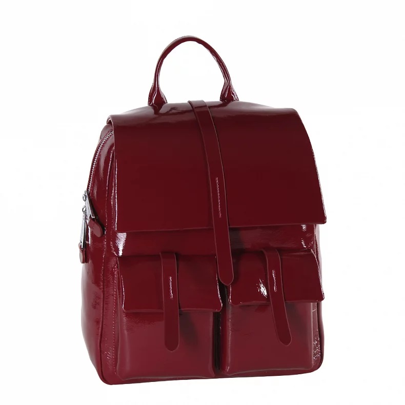 Материал: Натуральная кожа Классическая модель рюкзака, выполнен из натуральной лаковой кожи.  Дополнен серебристой фурнитурой. Данная модель закрывается на клапан, носится на плече или в руке. Встроенные ремни регулируются по длине. Так же имеется ручка. Каркас полужесткий.