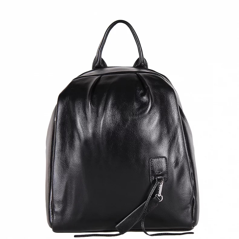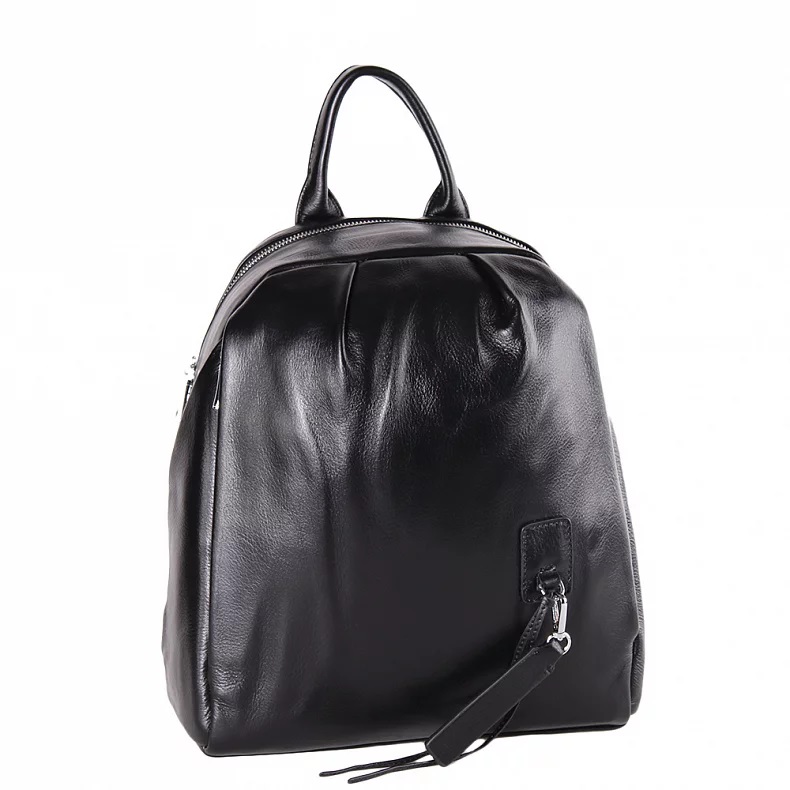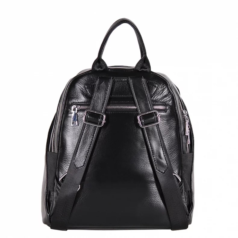 Классический рюкзак в черном цвете. Снаружи отдел на молнии. На задней части карман на молнии. На передней части два потайных кармана вертикальных на молниях. Внутри подкладочный материал. На боковых стенках два кармана на молниях и два открытых. Встроенные ремни регулируются по длине. Каркас мягкий. Фурнитура блестящее серебро.