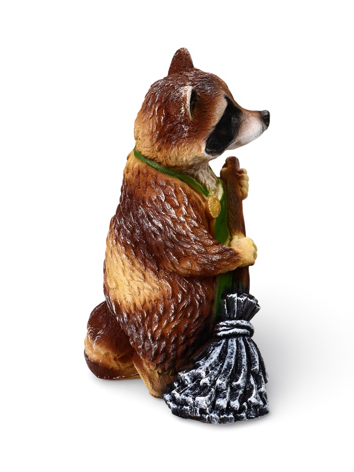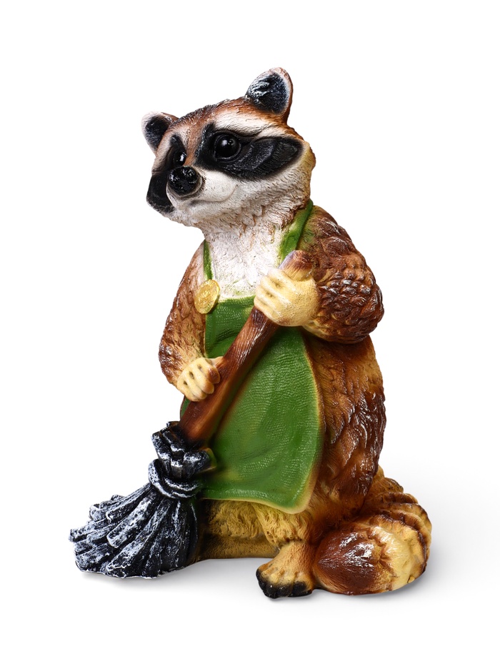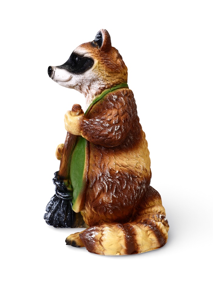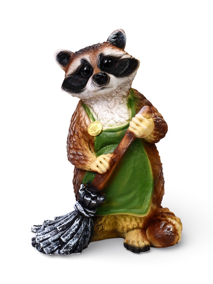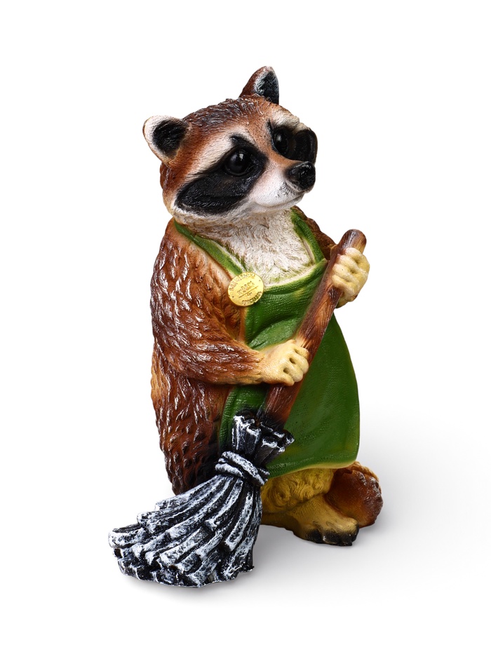 Садовая фигура «Енот с метлой» из полистоуна — сюжетный элемент уличного декора с понятным и доброжелательным образом. Енот изображён за делом, фигурка становится «участником» садовой жизни, а не нейтральным украшением. Персонаж сразу задаёт участку настроение и делает пространство более «живым».