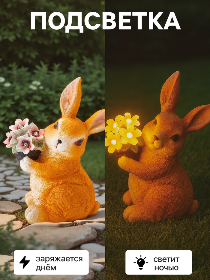 «Зайка с букетом» - это простое и очаровательное украшение для вашего сада. Милая днем и яркая вечером, она создаст атмосферу тепла и уюта без лишних хлопот. Выбирайте милый и практичный декор, который будет радовать вас весь сезон!