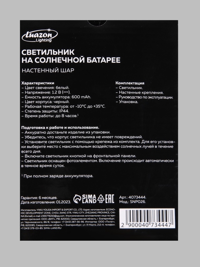 ДополнительноСветильник предназначен для работы в тёмное время суток. Если установить вблизи мощного источника света, он может не включиться. Комментарии к товару