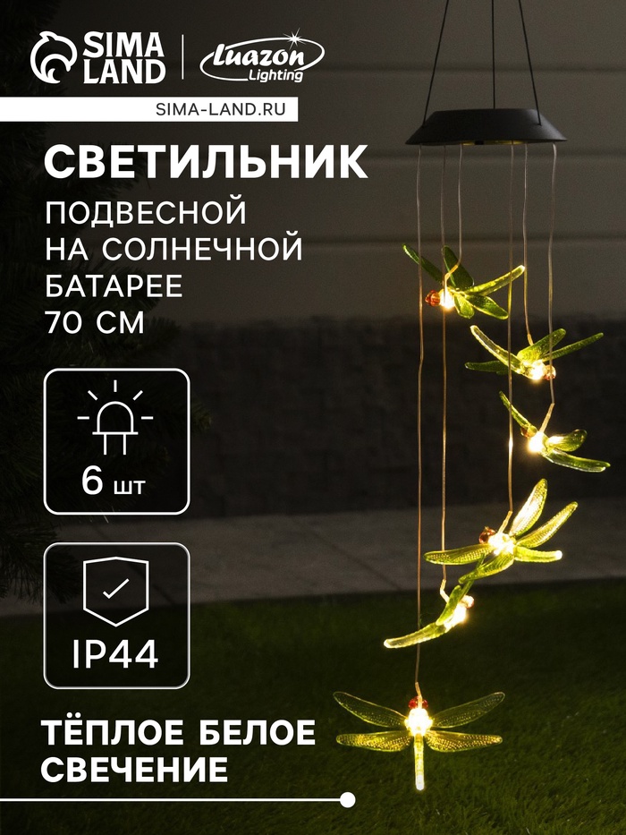 Габариты: 13,5 x 13,5 x 8,5 Доставка: Платная Страна: Китай В боксе: 45 шт В наборе: 1 шт Состав: Металл, пластик Материалы: металл, пластик Фасовка: по 1 шт Индивидуальная упаковка: Картонная коробка Габариты товара: 13,5 см × 13,5 см × 8,5 см Сертификат: ЕАС Количество ламп: 6 Цоколь: Встроенные LED Гарантийный срок, мес.: 6 Степень защиты: IP44 Материал основания: Пластик Цвет корпуса: Чёрный Температурный режим: от -10 до +35 °С Добавьте нотку волшебства в ваш сад с этим изящным светильником, который не только освещает, но и создает атмосферу уюта и гармонии. Его дизайн в виде стрекоз, парящих в воздухе, придает пространству особый шарм, а мягкое тёплое белое свечение превращает вечерний сад в сказочное место для отдыха. Этот светильник работает на солнечной батарее, что делает его не только экологичным, но и экономичным решением. Он автоматически включается с наступлением темноты и работает всю ночь, заряжаясь в течение дня. Благодаря степени защиты IP44, он устойчив к влаге и перепадам температур, что позволяет использовать его в любую погоду.
