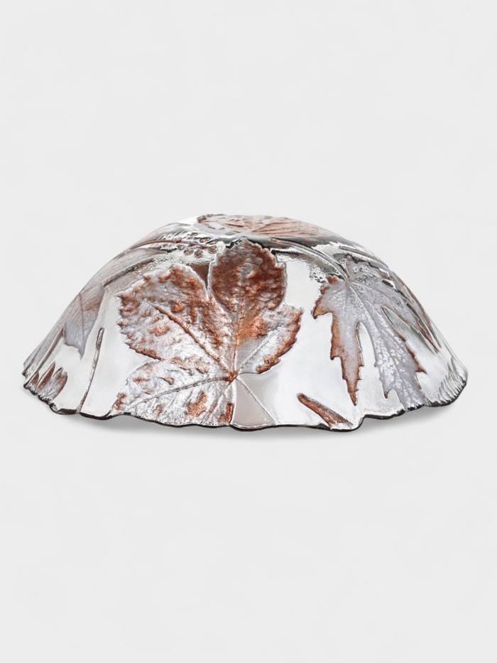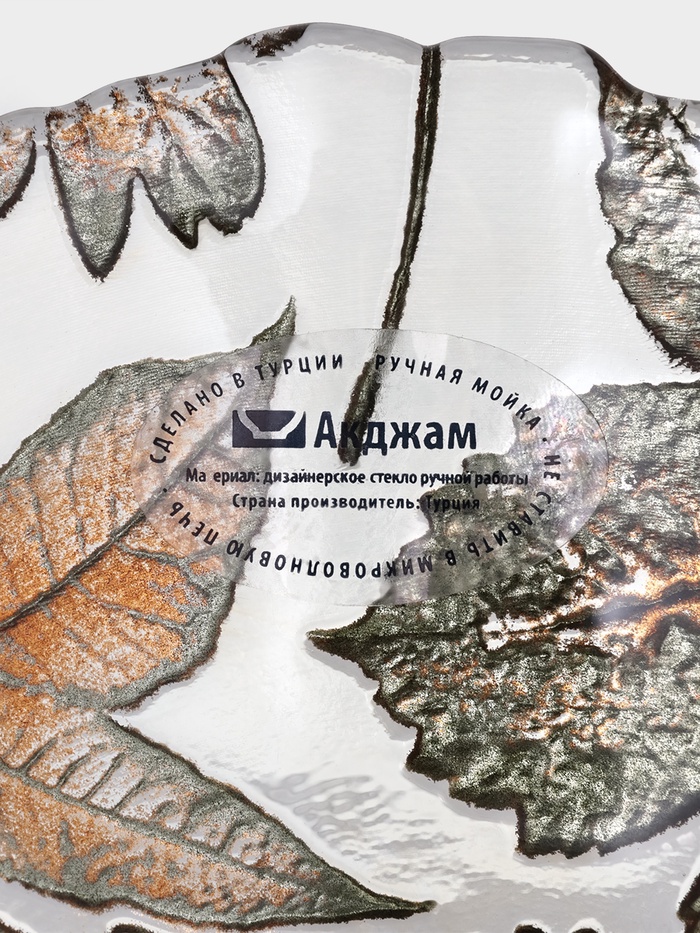 - Рельефный рисунок: узор по всей поверхности — не просто декор, а фактурная основа. Листья словно застывшие в стекле, придают тарелке объём и визуальную насыщенность.