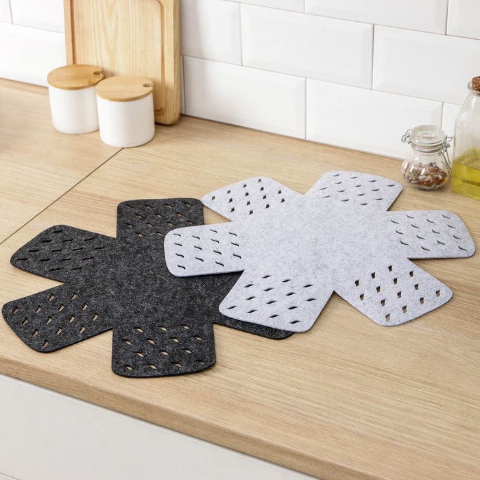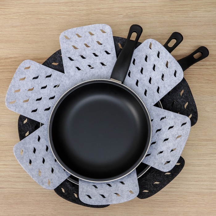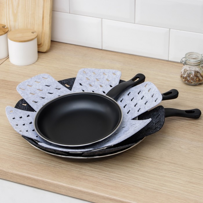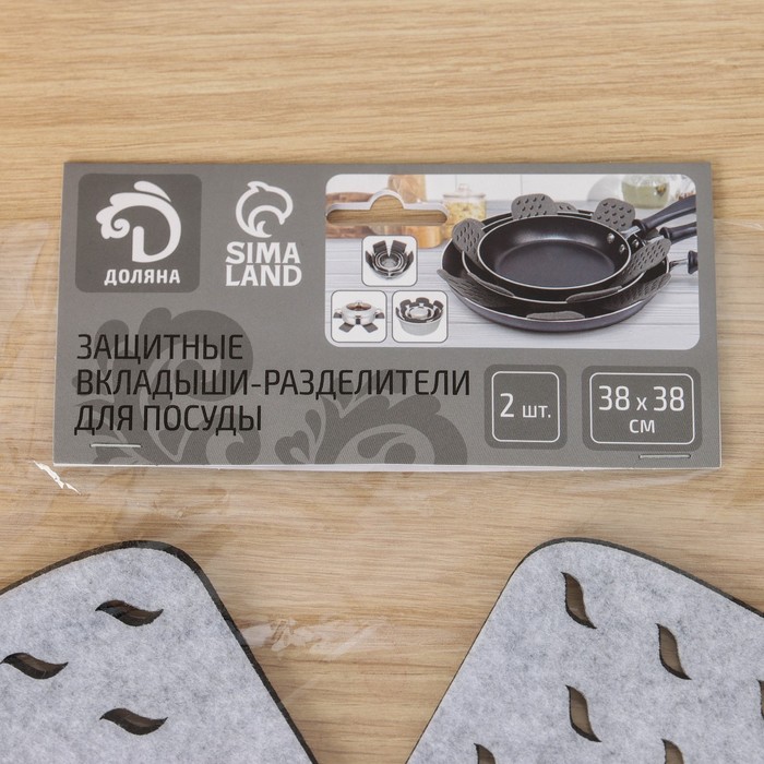 Габариты: 46,5 x 38 x 0,4 Страна: Китай В боксе: 100 набор Состав: Фетр Материалы: фетр Фасовка: по 1 набор Индивидуальная упаковка: Пакет (БОПП, полиэтилен, ПВХ, дой-пак) Габариты товара: 38 см × 38 см × 0,2 см Сертификат: Не подлежит сертификации Набор: Да Цвет: Чёрный, Серый Форма: Фигурная, Круглая Размер, см: 38 х 38 В наборе, шт.: 2 Тематика: Однотонная Рисунок: Нет Материал: Фетр Особенности: Без особенностей Фактурные: Нет Как защитить кухонную утварь от сколов и царапин? Воспользоваться защитными вкладышами для посуды. Разделители для посуды изготовлены из фетра, поэтому идеально подойдут для хранения кастрюль, сковородок, стеклянной и керамической посуды. Использование вкладышей продлевает срок службы посуды, сохраняя её первоначальный внешний вид. Также подойдут для бережной транспортировки. Положив салфетку между предметами, сможете защитить их поверхность от повреждений, царапин и сколов. КомплектацияВ комплекте: