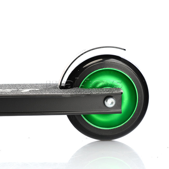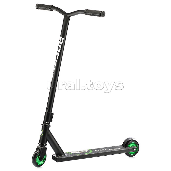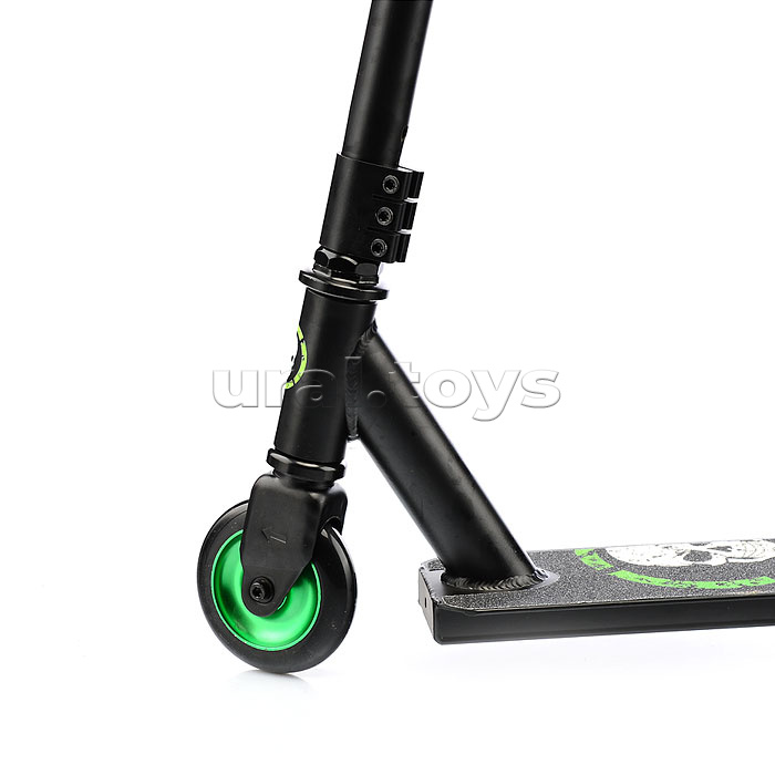 • Самокат трюковый двухколёсный, разборный. • Размеры самоката: 65х10х84 см. • Ручка по высоте не регулируется. • Ширина ручки: 46 см. • Ширина деки: 10 см. • При повороте рулевой ручки, поворачивается переднее колесо. • Противоскользящие резиновые ручки. • Задний ножной тормоз. • Колёса из алюминия с шинами из полиуретана.. • Диаметр колёс: 10 см. • Максимальная нагрузка: 100 кг. • Материал: алюминий. • Соответствует требованиям безопасности продукции. • Рекомендуемый возраст: 7 - 11 лет. • Рекомендуемый рост: 145 - 160 см. • Класс подшипников: ABEC-7 (608ZZ) • Без амортизатора. • Корпус вращется вокруг оси ручки.