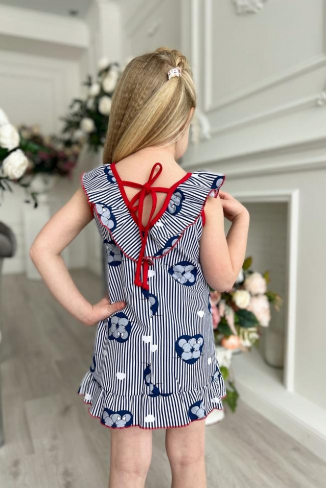 Сарафан для девочки, по горловине и низу изделия оборки, на спинке завязки.