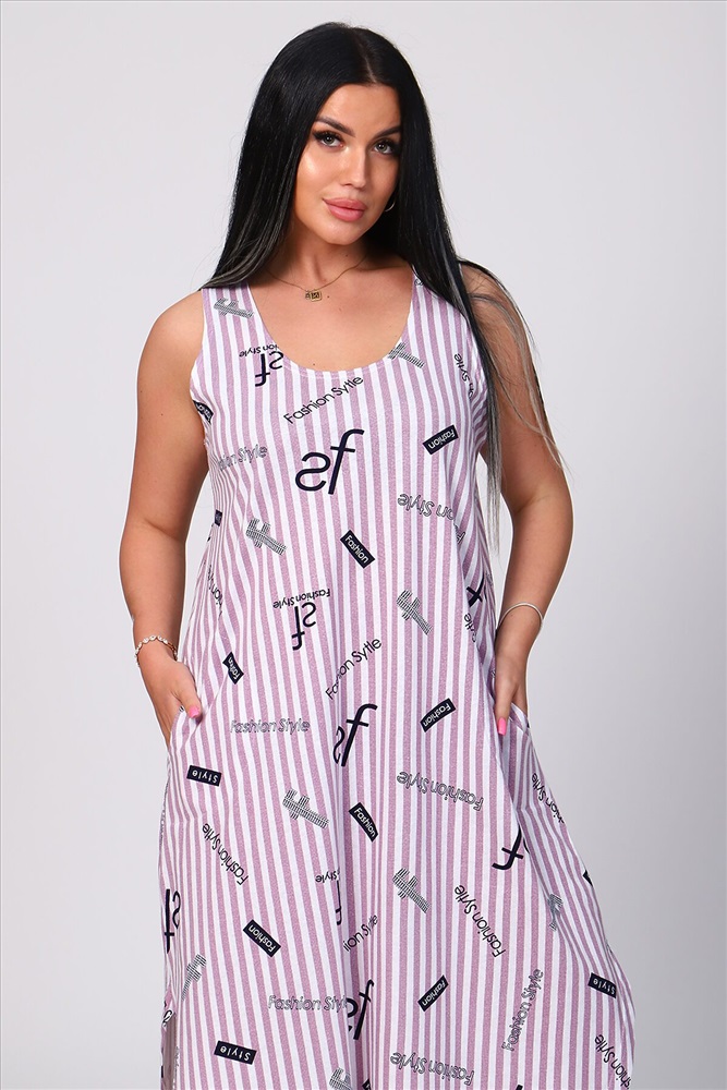 Сарафан женский в полоску, силуэт трапеция, удлиненный, без рукава, имеются накладные карманы, вырез горловины круглый, низ сарафана оформлен боковыми разрезами. Отличный вариант для повседневной носки из натурального хлопка.