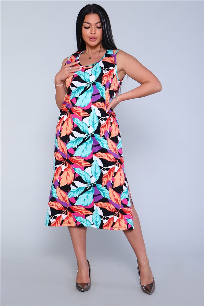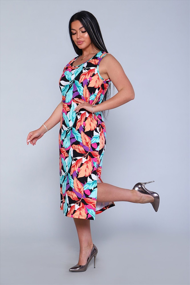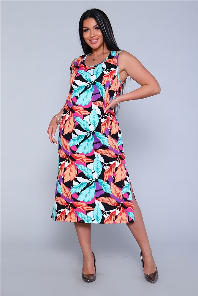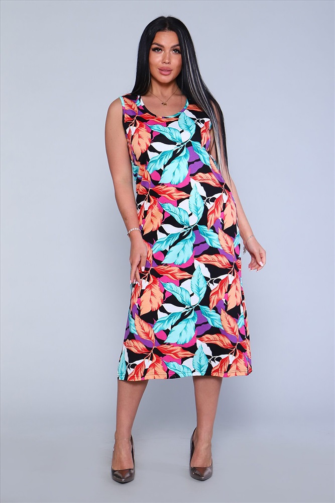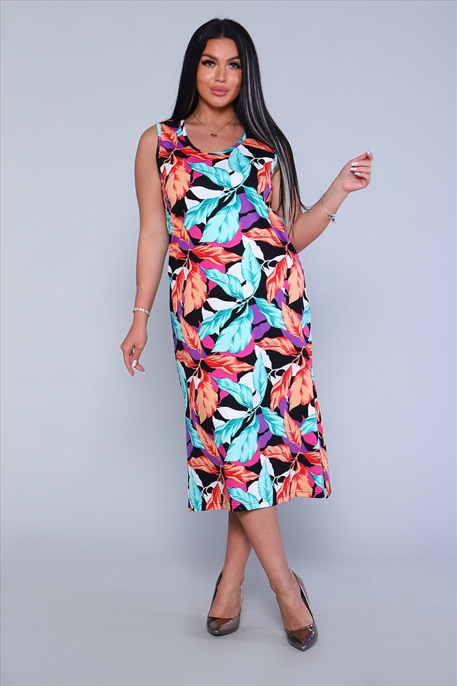 Страна производства: Россия Женское платье - сарафан прямого силуэта из трикотажного полотна (100% хлопок). Горловина и пройма отделана окантовочной беей в цвет изделия. Внизу по боковым швам разрезы. Длина изделия ниже колена. Удобный сарафан, приятный к телу, не стесняет движения, подойдет беременным. Яркие стойкие цвета ткани. Большие размеры широкий размерный ряд 44-62. Для дома и дачи, для отдыха и прогулок, в отпуск, на море.