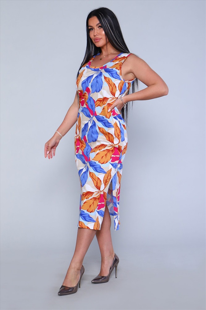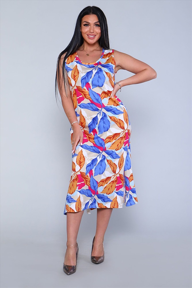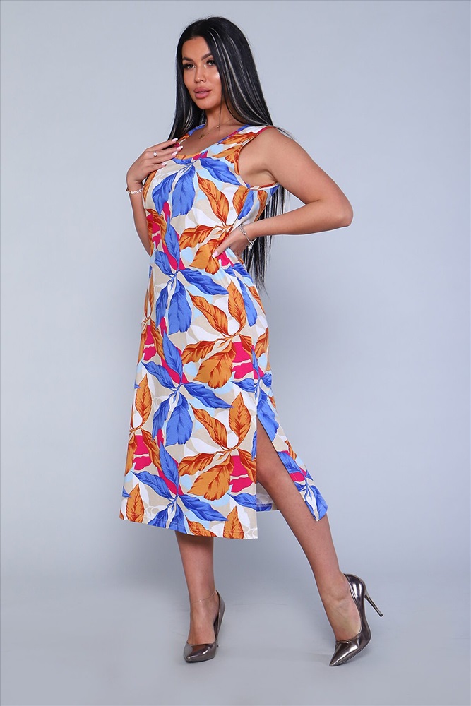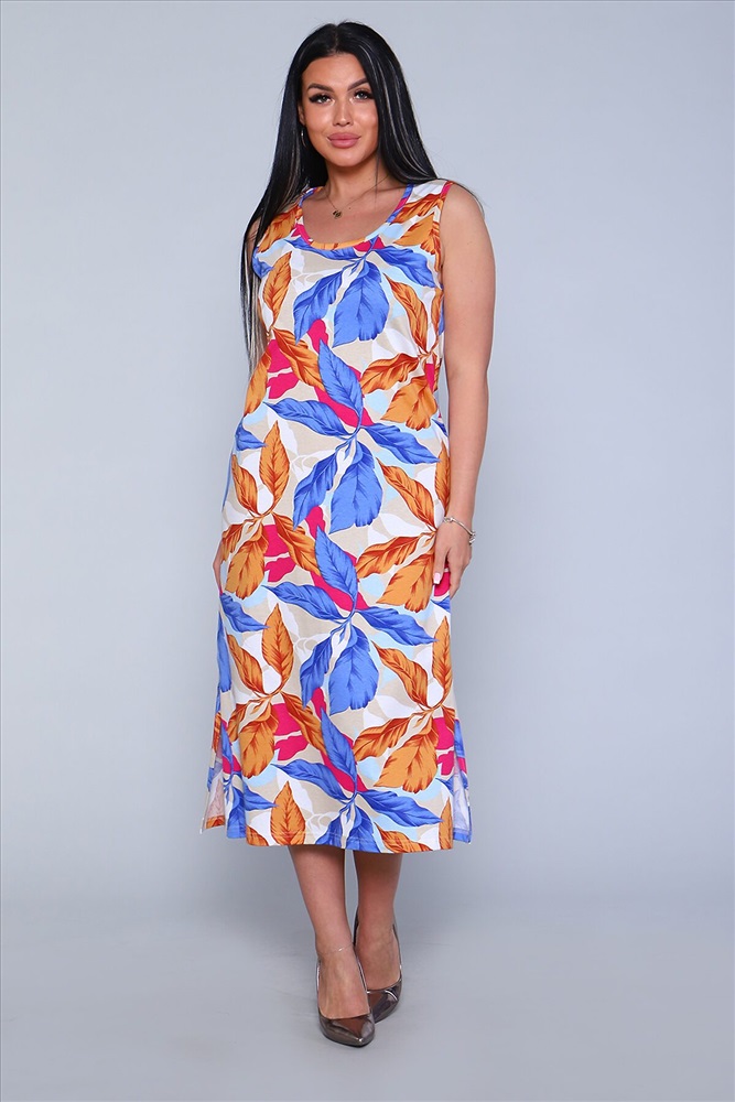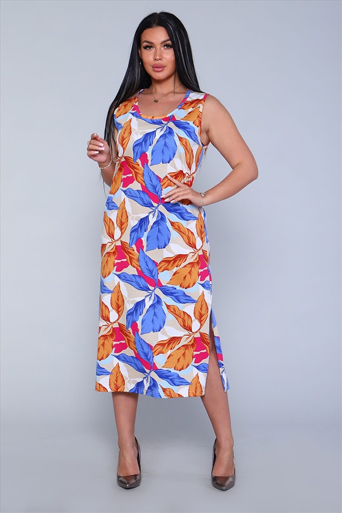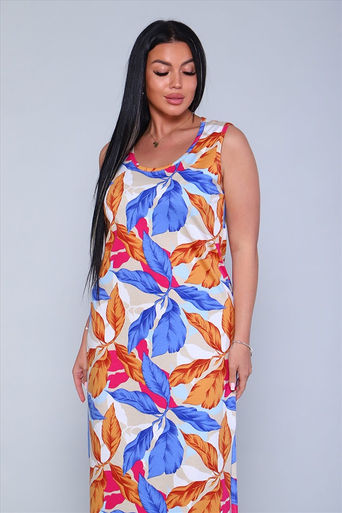 Страна производства: Россия Женское платье - сарафан прямого силуэта из трикотажного полотна (100% хлопок). Горловина и пройма отделана окантовочной беей в цвет изделия. Внизу по боковым швам разрезы. Длина изделия ниже колена. Удобный сарафан, приятный к телу, не стесняет движения, подойдет беременным. Яркие стойкие цвета ткани. Большие размеры широкий размерный ряд 44-62. Для дома и дачи, для отдыха и прогулок, в отпуск, на море.
