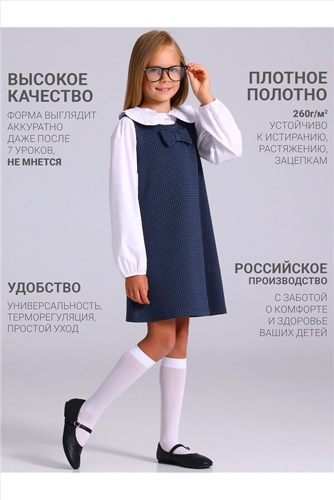 Сарафан для девочки из плотного полотна с рельефным рисунком, выполненным с применением жаккардового плетения. Изделие без рукавов, украшено аккуратным бантиком. Отличный вариант для школьницы на каждый день! Уход: только машинная стирка (руками не стирать!) при температуре 40 градусов, без предварительного замачивания.