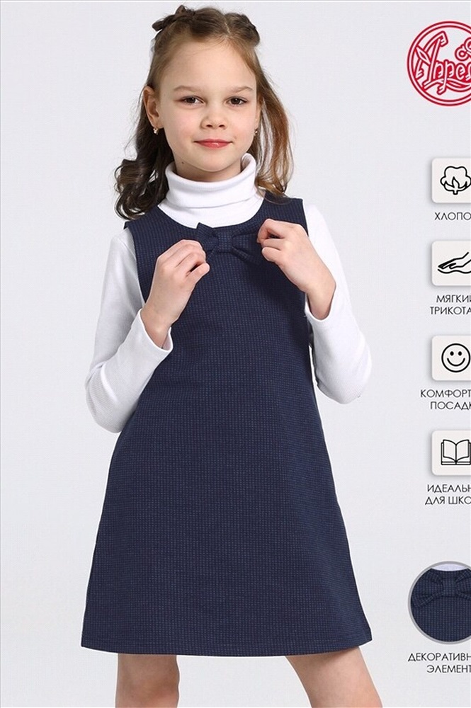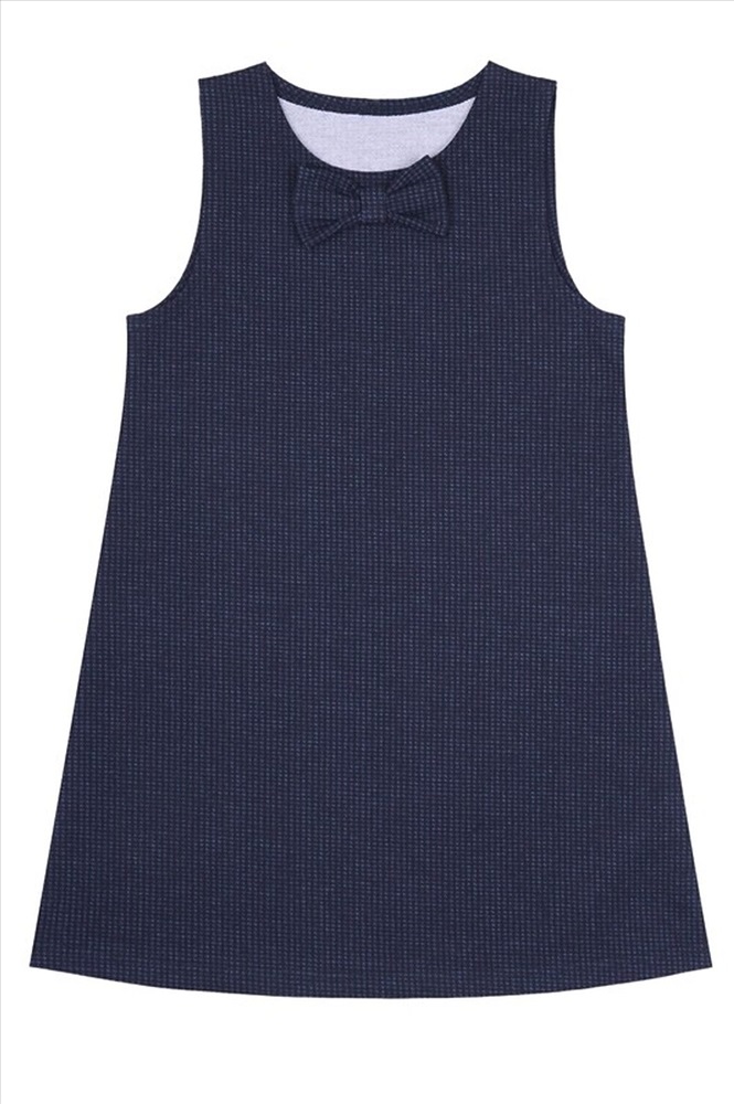 Сарафан для девочки выполнен из теплого хлопкового полотна с лайкрой. Изделие без рукавов, украшено аккуратным бантиком. Отличный вариант для школьницы на каждый день! Уход: только машинная стирка (руками не стирать!) при температуре 40 градусов, без предварительного замачивания. Тип полотна - футер