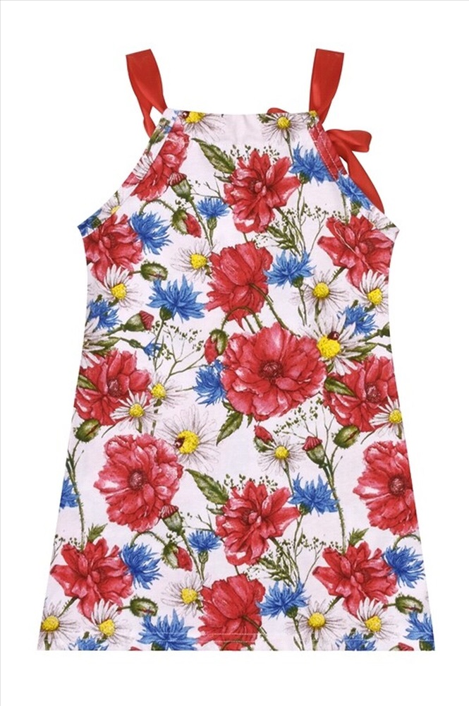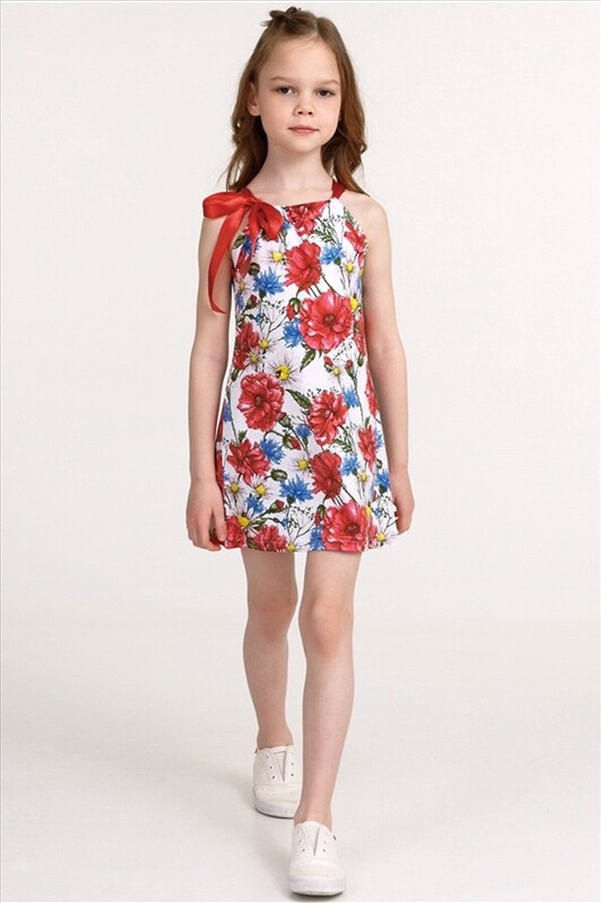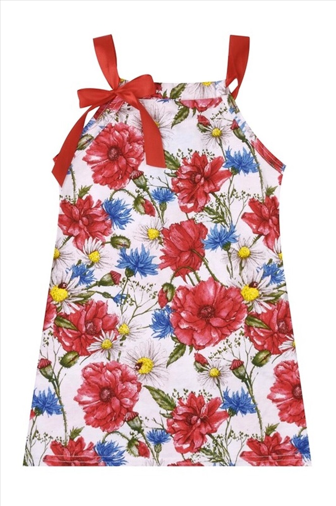 Короткий сарафан для девочки выполнен из легкого хлопкового полотна. Атласная лента и яркая набивка создаст праздничное настроение в летний день! Уход: только машинная стирка (руками не стирать!) при температуре 40 градусов, без предварительного замачивания. Тип полотна - кулир