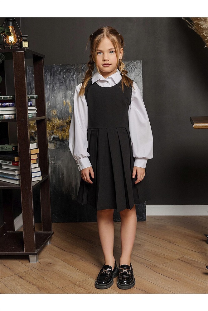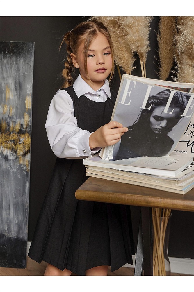Классический сарафан для девочки из костюмной ткани. Строгий черный сарафан из качественной костюмной ткани создает аккуратный силуэт и подходит для особых случаев, школы и повседневной носки. Отрезная по талии юбка с встречными складками спереди добавляет объем и динамику, сохраняя при этом опрятный вид. Удобные боковые карманы позволяют хранить мелочи, сочетая функциональность со стилем. Застежка-«щель» на спинке обеспечивает комфортное надевание и снимание. Сарафан комбинируется с блузками, водолазками и рубашками, создавая разнообразные образы — от строгого школьного до нарядного. Плотная костюмная ткань держит форму, не мнется и сохраняет презентабельный вид весь день.