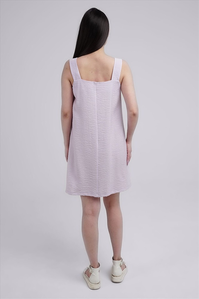 Сарафан из текстильного полотна штапель-креп. Свободного кроя, длиной мини. По горловине внутренняя обтачка, широкая бретель. По спинке средний шов.