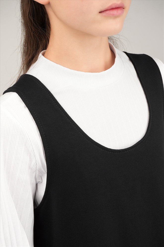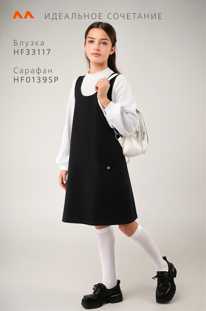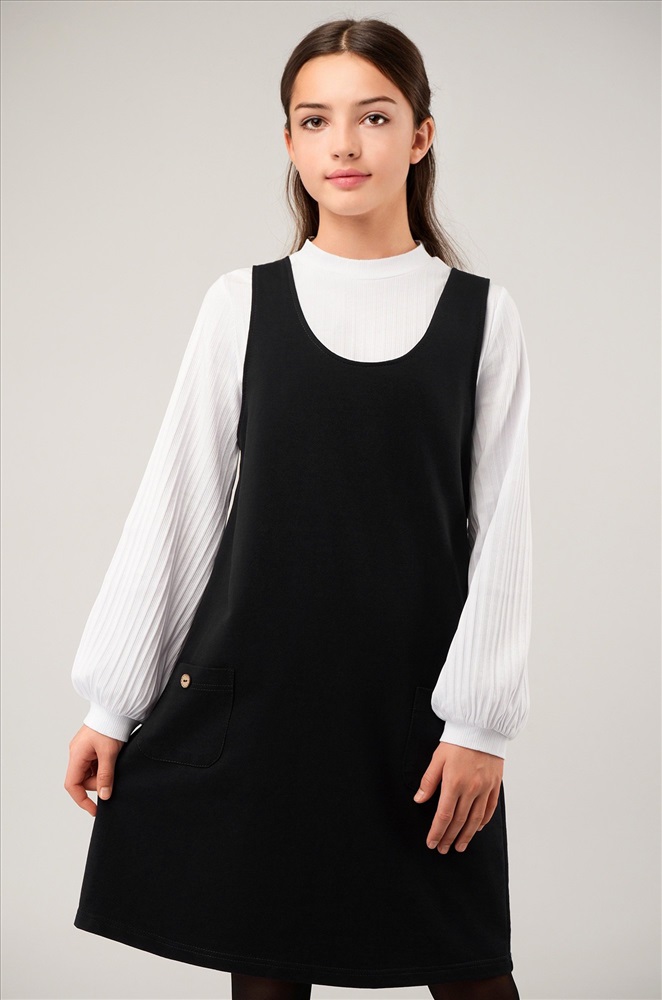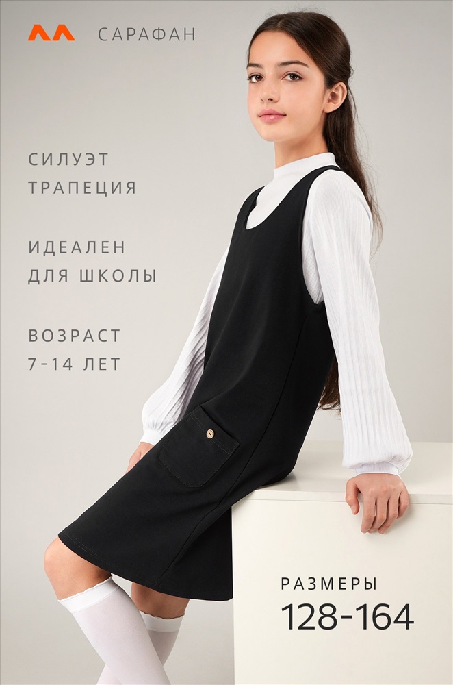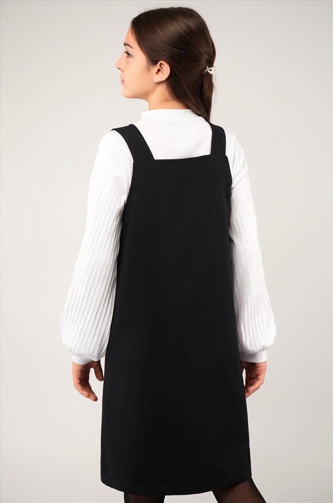 Очередная 5+ в твой дневник – за этот очаровательный сарафан! Детский сарафан для девочек и девочек-подростков выполнен из мягкого футера двухнитки. Комфортный А-силуэт, длина выше колена, аккуратные карманы – этот черный сарафан для детей точно станет любимым элементом школьной формы и покорит сердца окружающих!