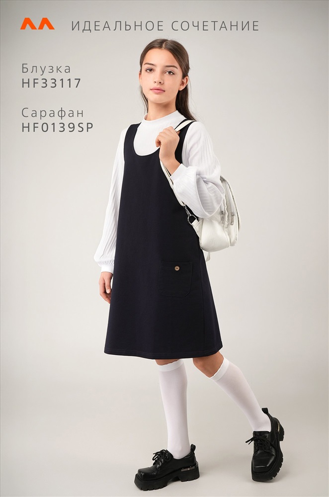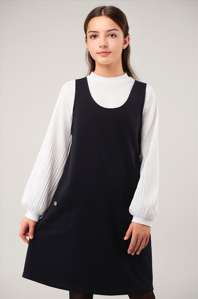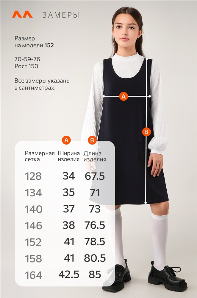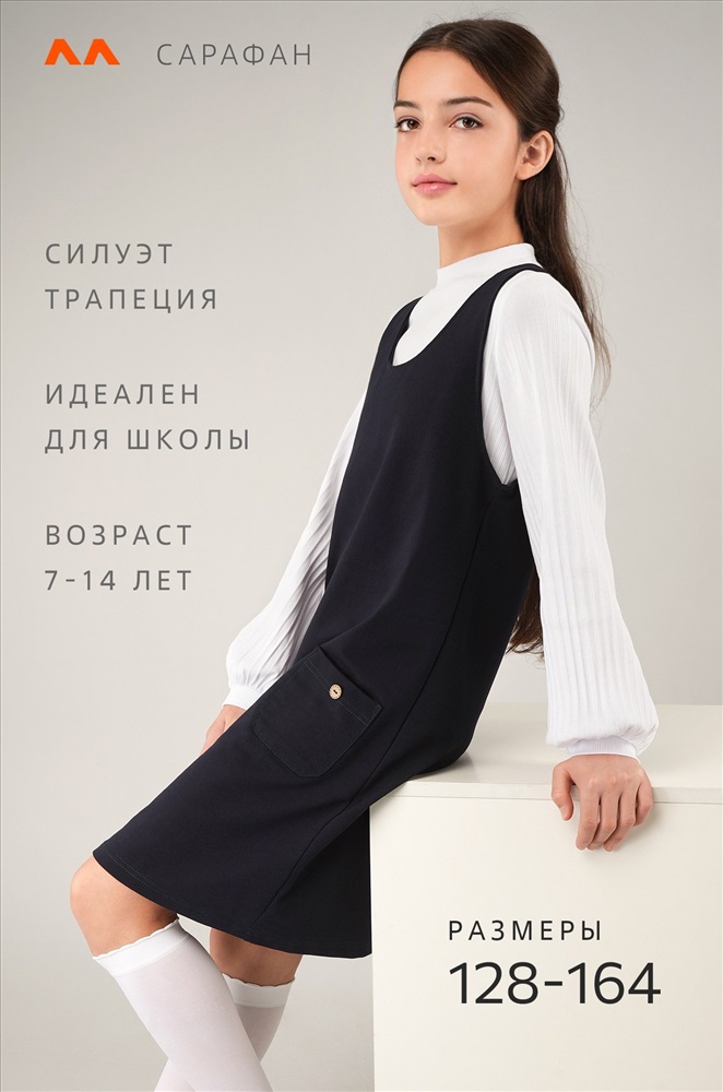 Очередная 5+ в твой дневник – за этот очаровательный сарафан! Детский сарафан для девочек и девочек-подростков выполнен из мягкого футера двухнитки. Комфортный А-силуэт, длина выше колена, аккуратные карманы – этот синий сарафан для детей точно станет любимым элементом школьной формы и покорит сердца окружающих!