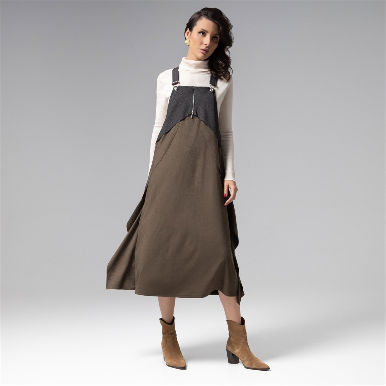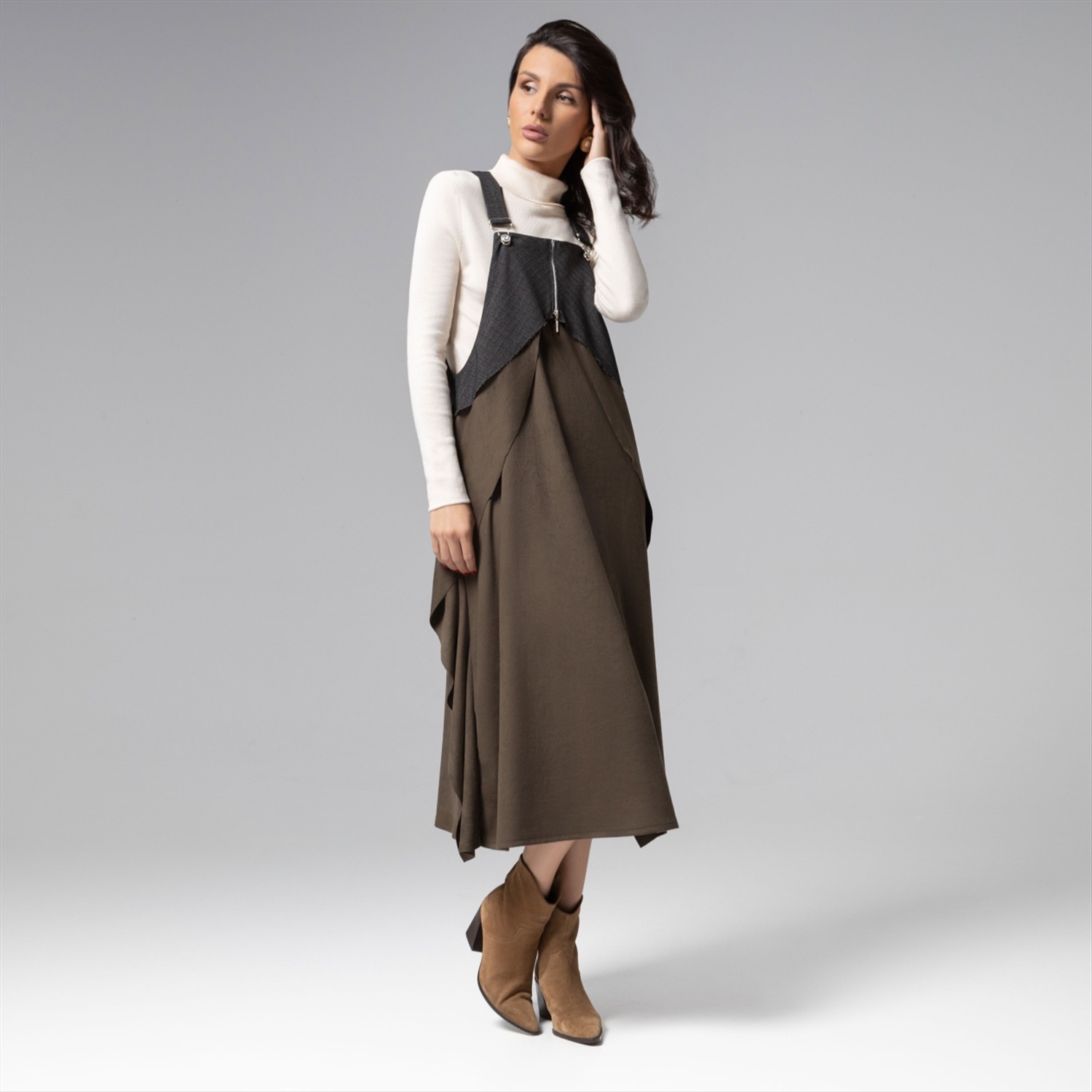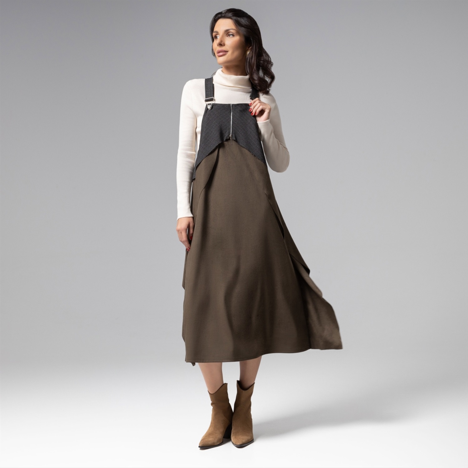 Сарафан-миди в оттенках хаки: авангардная элегантность. Свободный новаторский крой, сочетающий трендовую экозамшу и костюмную ткань премиального качества, создаёт архитектурный силуэт со шлейфом восточной философии. Воздушные рюши по бокам подчёркивают игру света на сложной поверхности ткани. Сарафан ЧАРУТТИ представляет собой манифест роскошного casual, где комфортный крой встречается с нетривиальным дизайном. Комментарии к товару