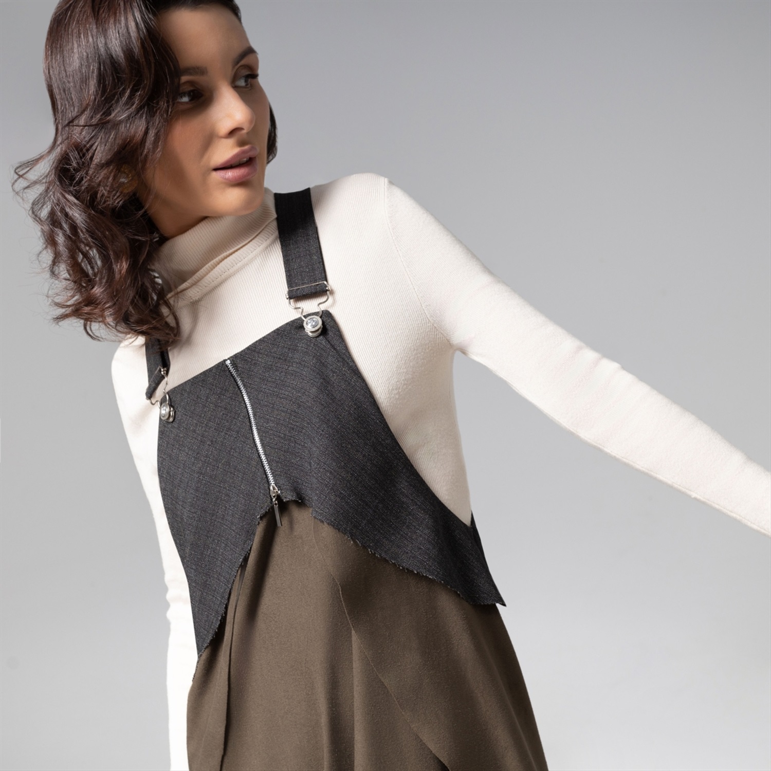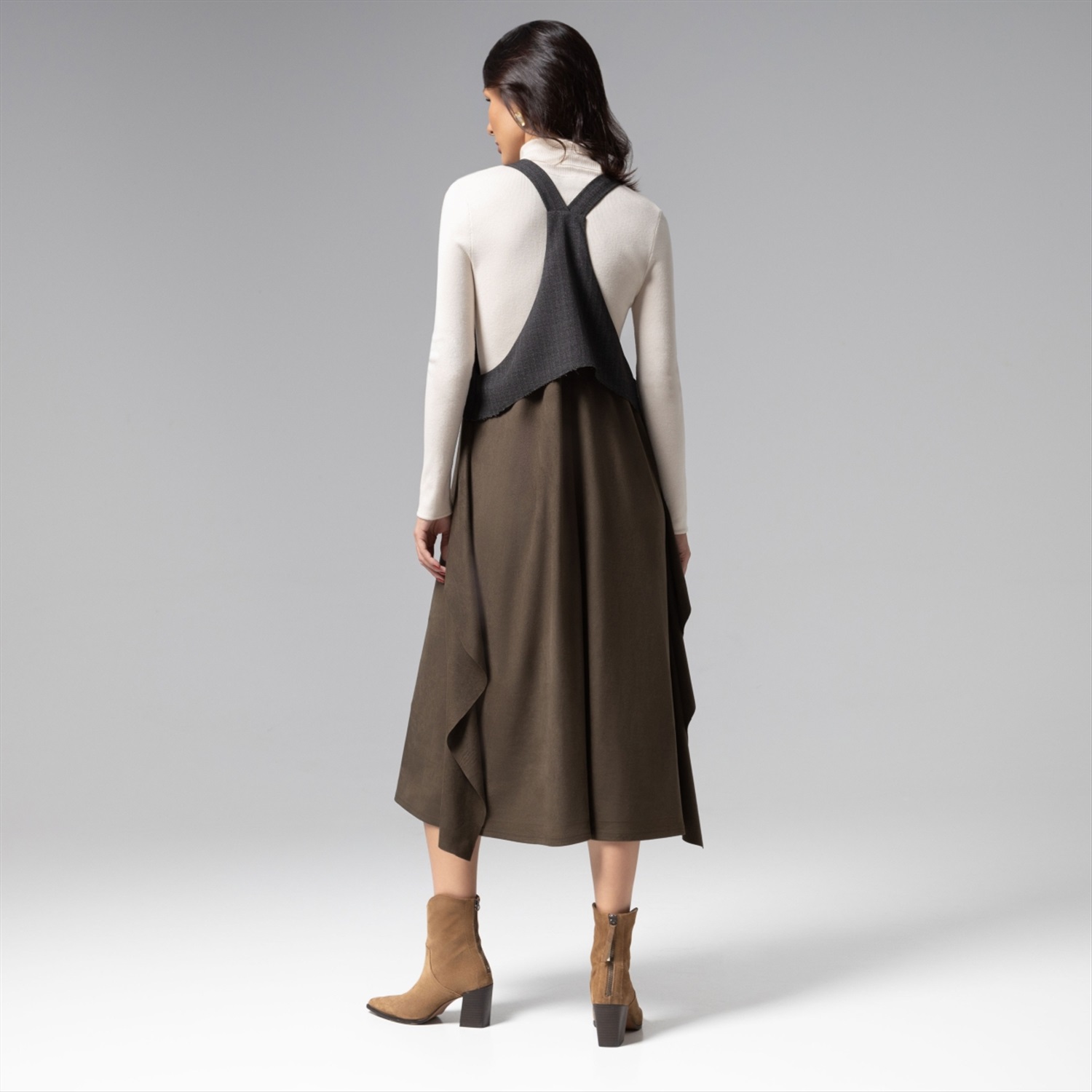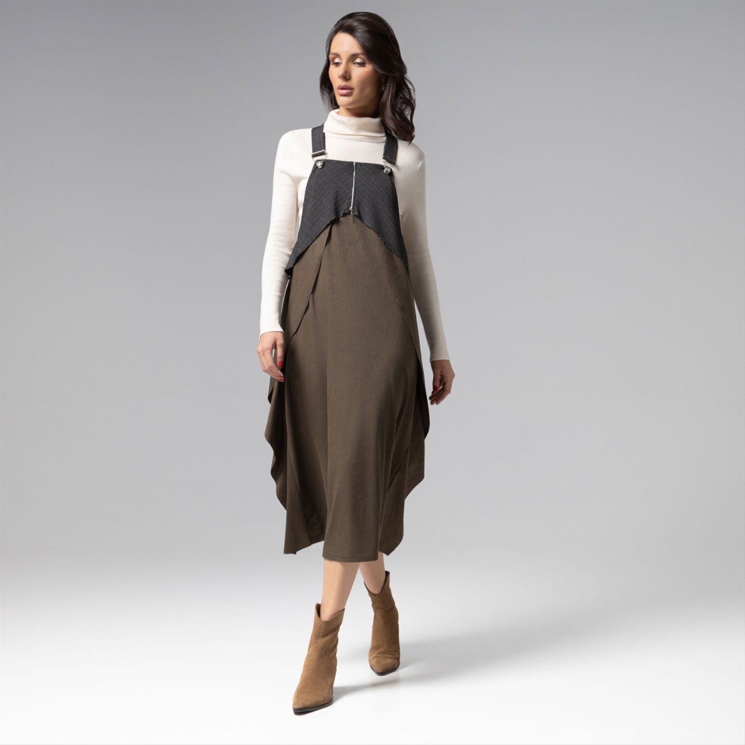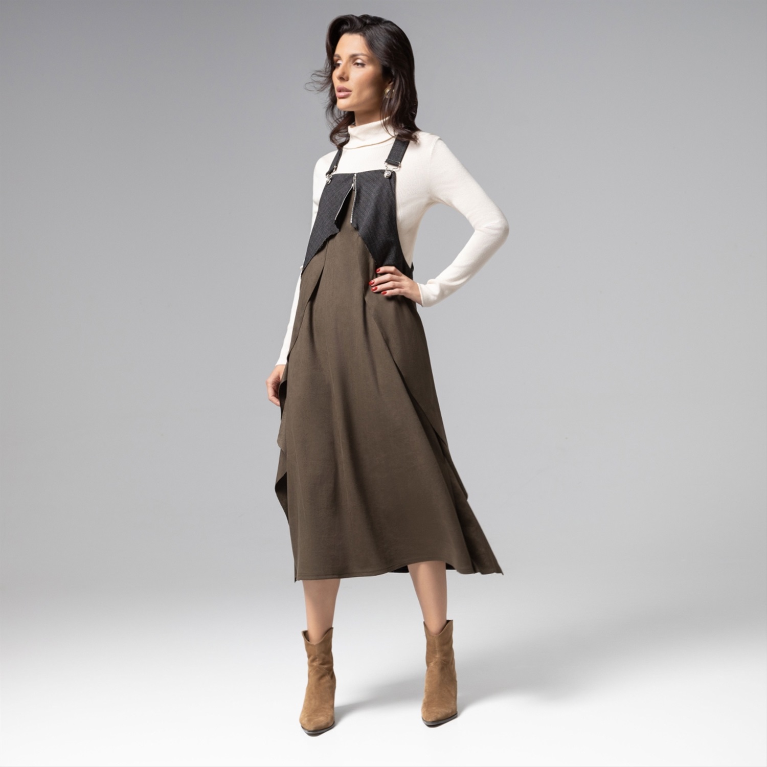 Сарафан-миди в оттенках хаки: авангардная элегантность. Свободный новаторский крой, сочетающий трендовую экозамшу и костюмную ткань премиального качества, создаёт архитектурный силуэт со шлейфом восточной философии. Воздушные рюши по бокам подчёркивают игру света на сложной поверхности ткани. Сарафан ЧАРУТТИ представляет собой манифест роскошного casual, где комфортный крой встречается с нетривиальным дизайном. Комментарии к товару