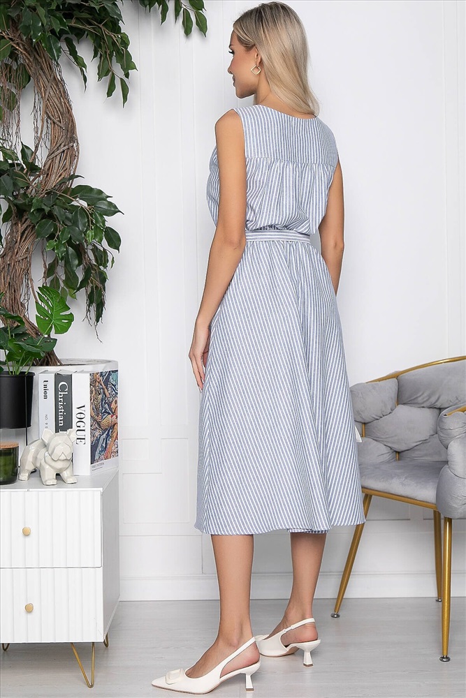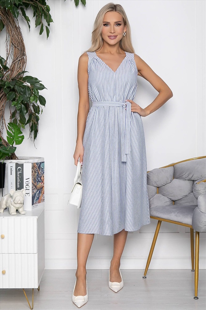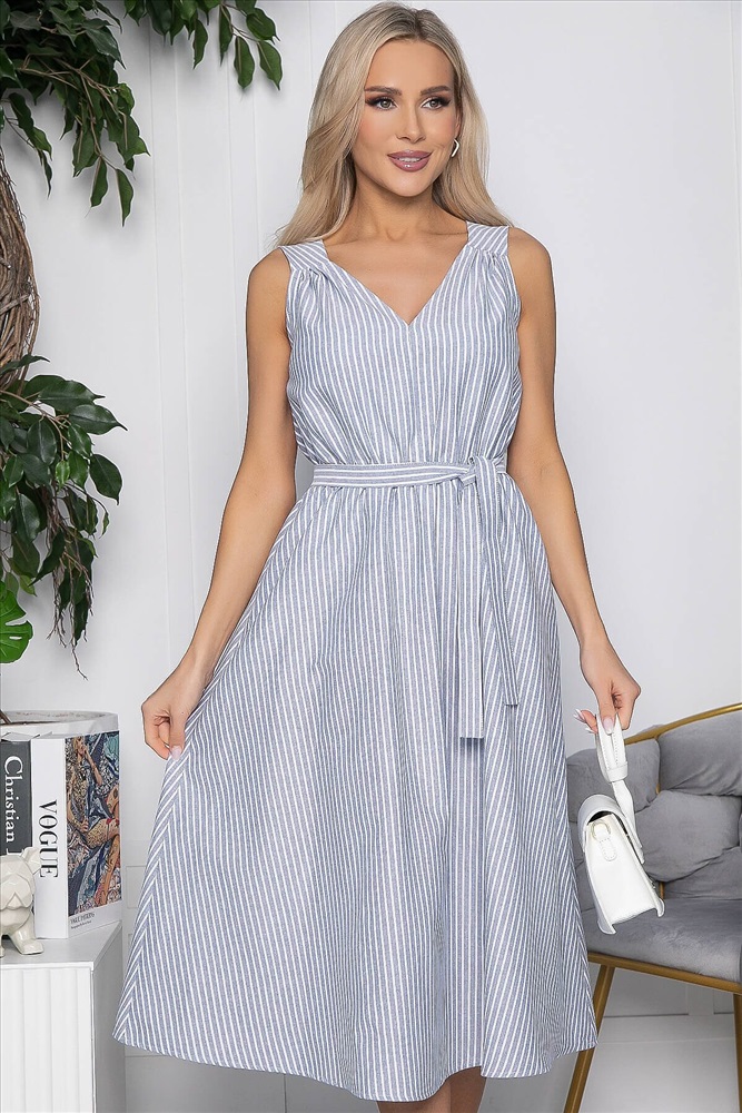 Артикул: П10395. Тип ткани: натуральная. Материал: плательный "лён". Состав: 50% хлопок, 50% п/э. Цвет: голубой. Принт: полоска. Длина: миди. Вид застежки: без застёжки. Карманы: отсутствуют. Силуэт: приталенный. Подкладка: отсутствует. Длина изделия по спинке: 44-48/ 113 см, 50-52/ 114 см. Размер изделия на модели: 44. Рост модели: 168 см.