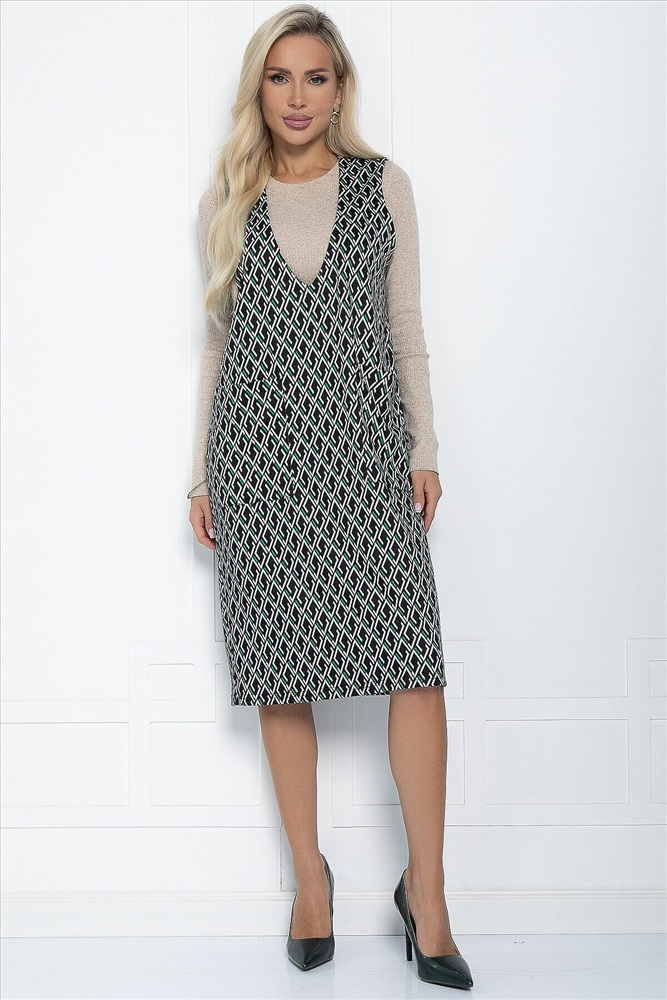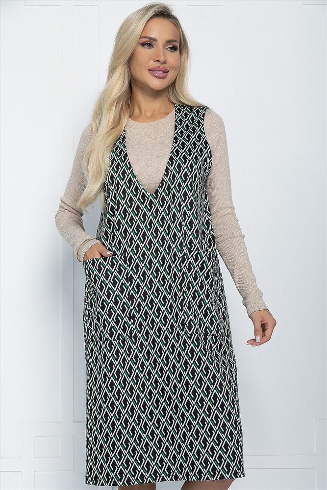 Артикул: П11214. Тип ткани: смесовая. Состав: 65% полиэстер, 30% вискоза, 5% эластан. Материал: трикотаж. Цвет: темно-зеленый. Принт: геометрические фигуры (ромбы). Длина: миди. Вид застежки: без застежки. Силуэт: прямой. Карманы: есть. Подкладка: отсутствует. Декоративные элементы: накладные карманы. Длина по спинке от верхней точки плеча: 46/ 102 см, 48/ 103 см, 50/ 104 см, 52/ 105 см, 54/ 106 см. Размер изделия на модели: 44. Рост модели: 168 см.