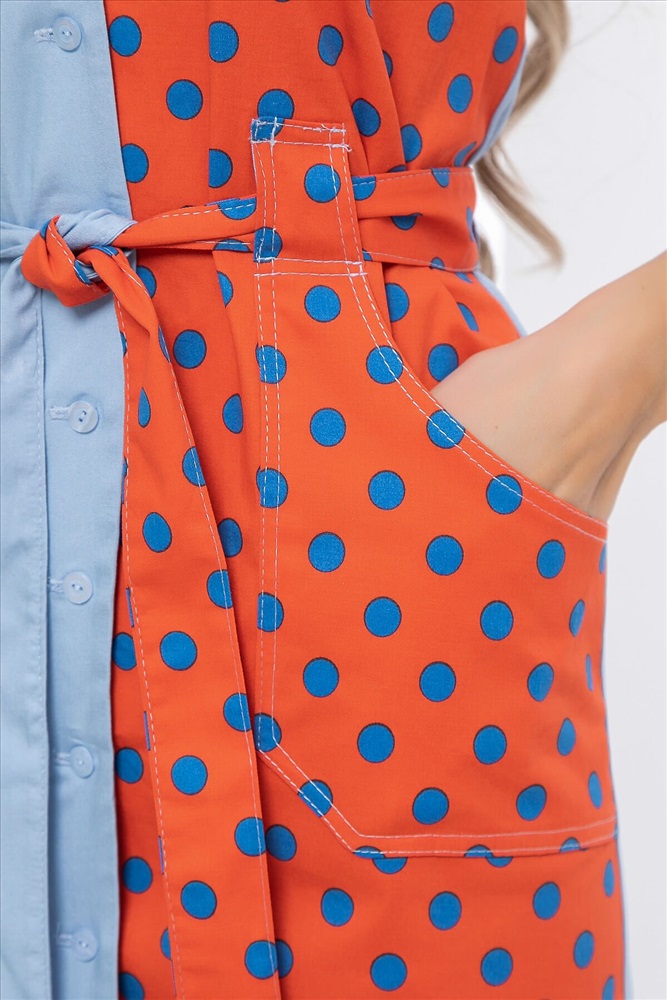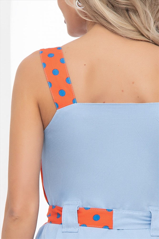 Артикул: П5900. Ткань: джинс, вискоза. Состав: 65% вискоза, 30% п/э, 5% эластан. Цвет: голубой, оранжевый. Принт: горох. Вид застежки: пуговицы. Силуэт: приталенный. Карманы: есть. Тип горловины: каре. Длина изделия по спинке (без учёта бретелей): 44/ 79 см, 46/ 80 см, 48/ 80 см, 50/ 81 см, 52/ 82 см. Рост модели: 168 см.