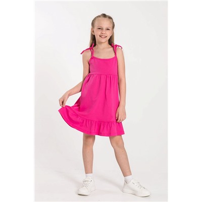 Летний сарафан для девочек с завязывающимися бретелями выполнен из кулирки. К лифу притачана юбка с широкой оборкой по низу.