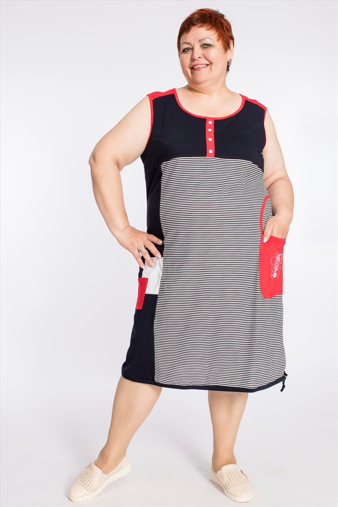 Тип длинны (для платьев): До колена Вид ткани: Кулирка Сезон: Летний Состав: Хлопок 100% Цвет Номенклатуры: синий полуночный Сарафан выполнен из кулирки, 100% хлопок. Вырез горловины круглый, с планкой с пуговицами. Пройма и горловина обработаны бейкой из яркого отделочного полотна. Из этого же полотна выполнены кокетки полочки, карман с вышивкой и один из настроченных прямоугольников. Верхние части полочки и спинки синие, нижние полосатые, кроме правой стороны - она синяя, как и кулиска со шнуром. Комментарии к товару