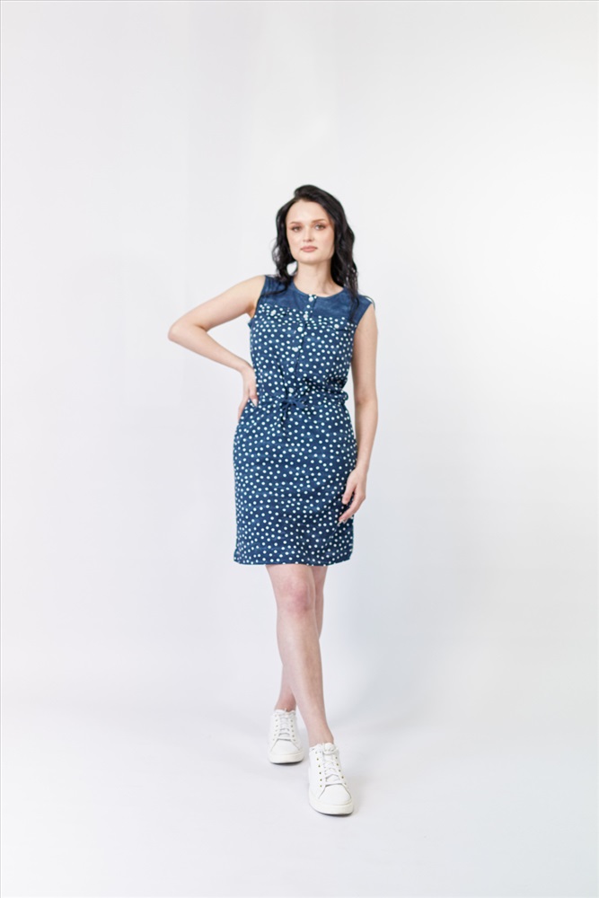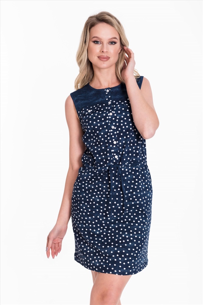Тип длинны (для платьев): Мини Вид ткани: Кулирка Сезон: Летний Состав: Хлопок 100% Цвет Номенклатуры: синий Сарафан из кулирки, 100% хлопок. Отрезной по линии талии, с кулиской со шнуром. Круглый вырез горловины и проймы, обработаны бейкой. Кокетки на полочке из отделочного полотна, в швах притачивания кокеток клапаны, закрепленные пуговицами. На лифе, до талии размещена планка с пуговицами. На юбке расположены боковые карманы. Комментарии к товару