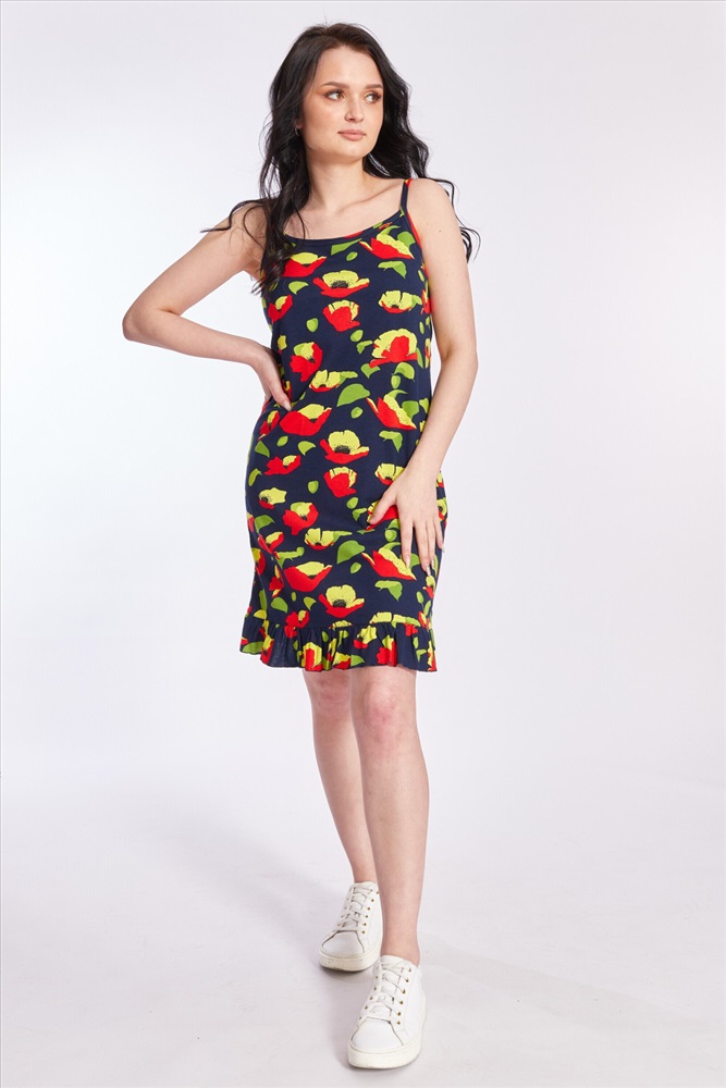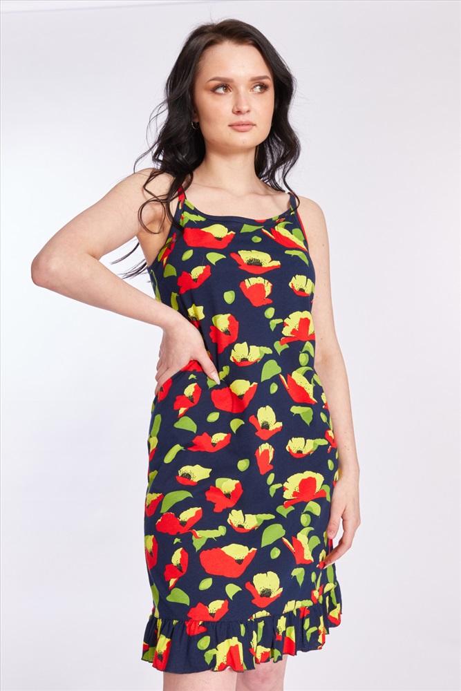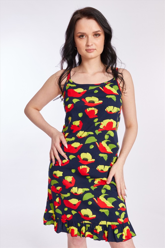 Тип длинны (для платьев): До колена Вид ткани: Кулирка Сезон: Летний Состав: Хлопок 100% Цвет Номенклатуры: красный/синий Сарафан из кулирки, 100% хлопок. На тонких бретелях и с оборкой по низу. Комментарии к товару
