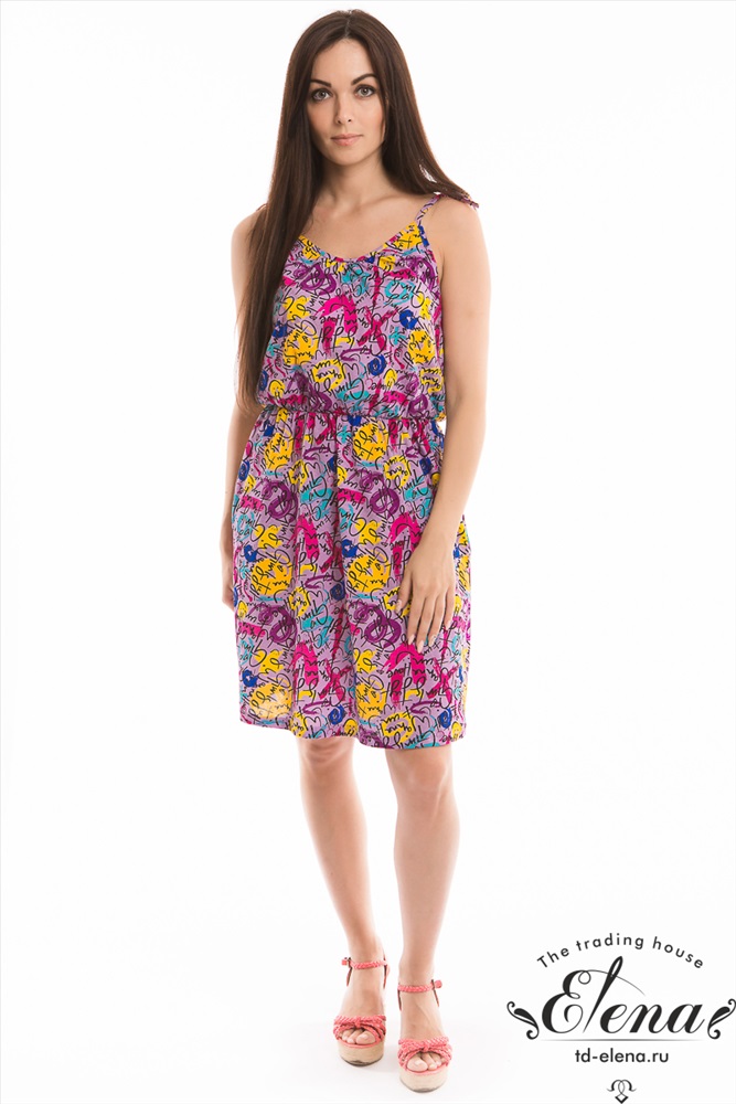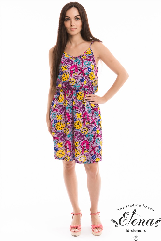 Тип длинны (для платьев): До колена Вид ткани: Кулирка Сезон: Летний Состав: Хлопок 100% Цвет Номенклатуры: разноцветный Сарафан на бретельках выполнен из х/б полотна с набивным рисунком. На резинке по талии и с карманами по бокам. Комментарии к товару