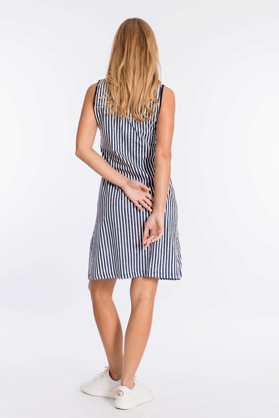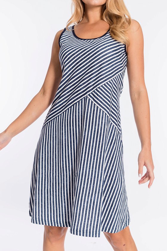 Сарафан выполнен из кулирки в вертикальную полоску. Детали сшиты с разным направлением полос, что делает модель сарафана интересной. Горловина и проймы обработаны однотонной бейкой. Внизу силуэт сарафана расклешён.