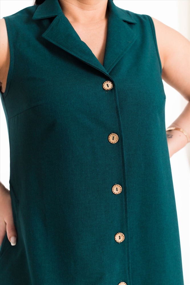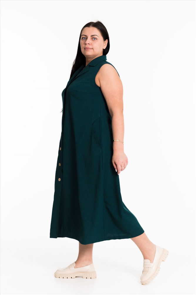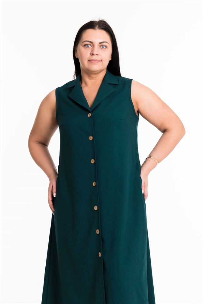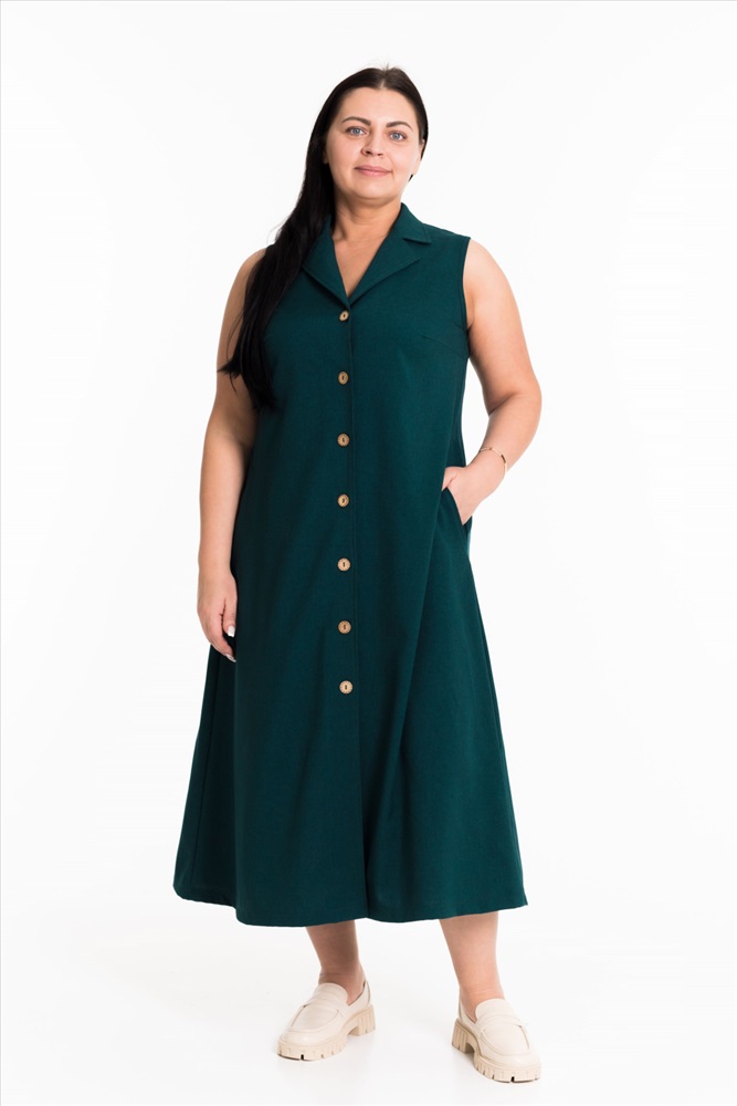 Сарафан выполнен из однотонного искусственного льна. Сарафан длиной миди спереди застегивается на пуговицы, воротник отложной. В боковых швах размещены карманы.