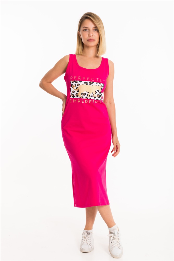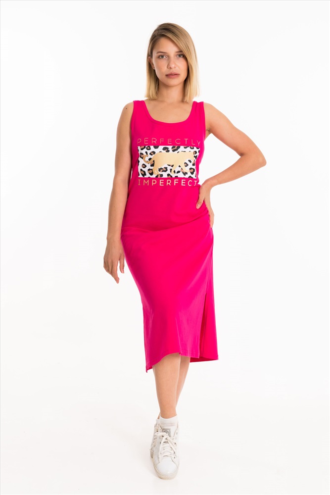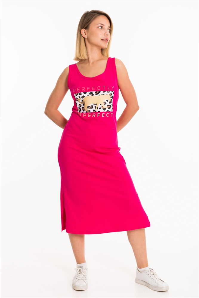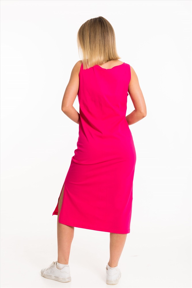 Тип длинны (для платьев): До колена Вид ткани: Кулирка Сезон: Летний Состав: Хлопок 100% Цвет Номенклатуры: малина Сарафан выполнен из однотонного трикотажного полотна. Круглый вырез горловины и проймы изделия обработаны бейкой. Спереди расположен принт. Длина до колена, по бокам разрезы. Комментарии к товару